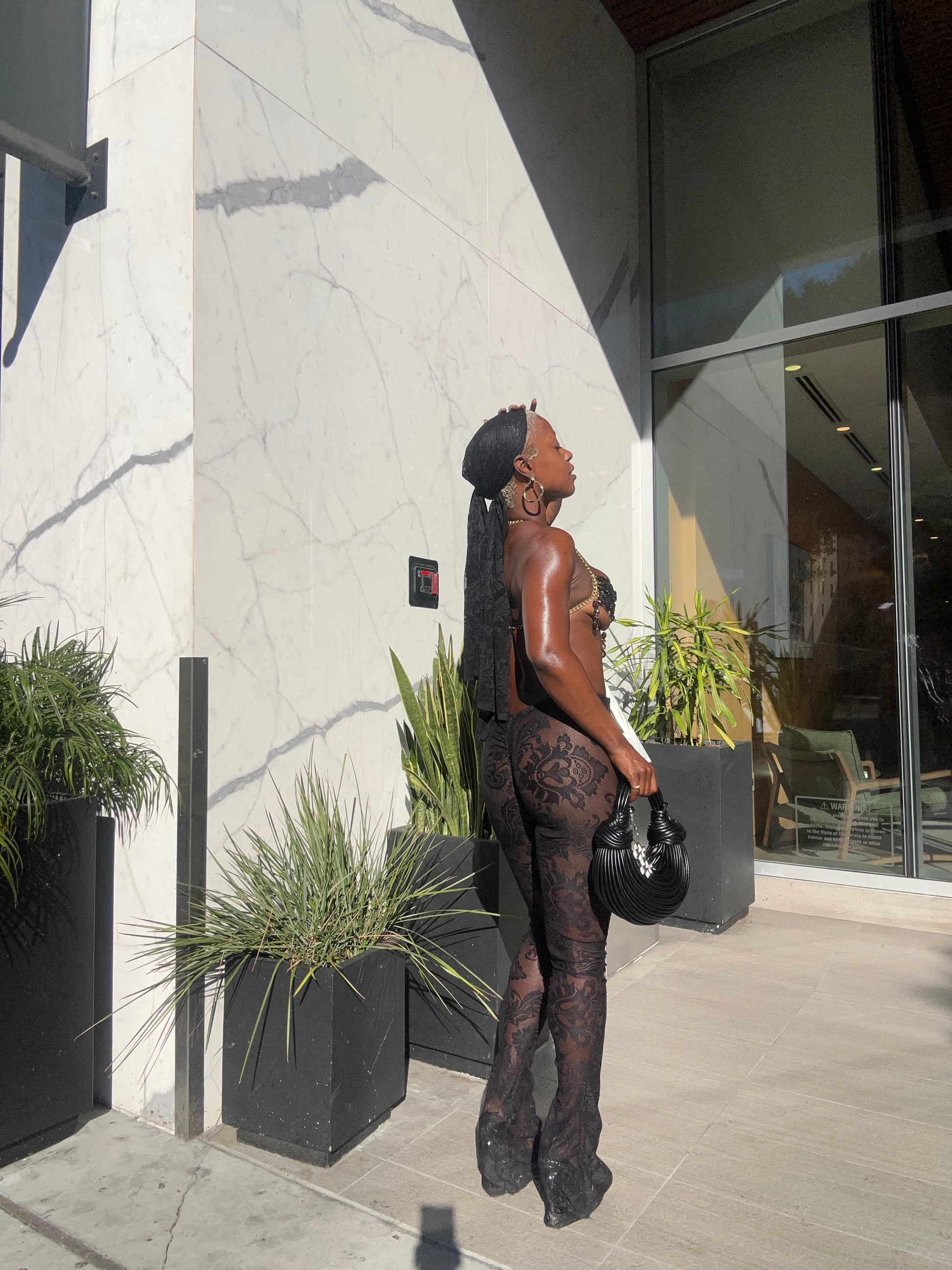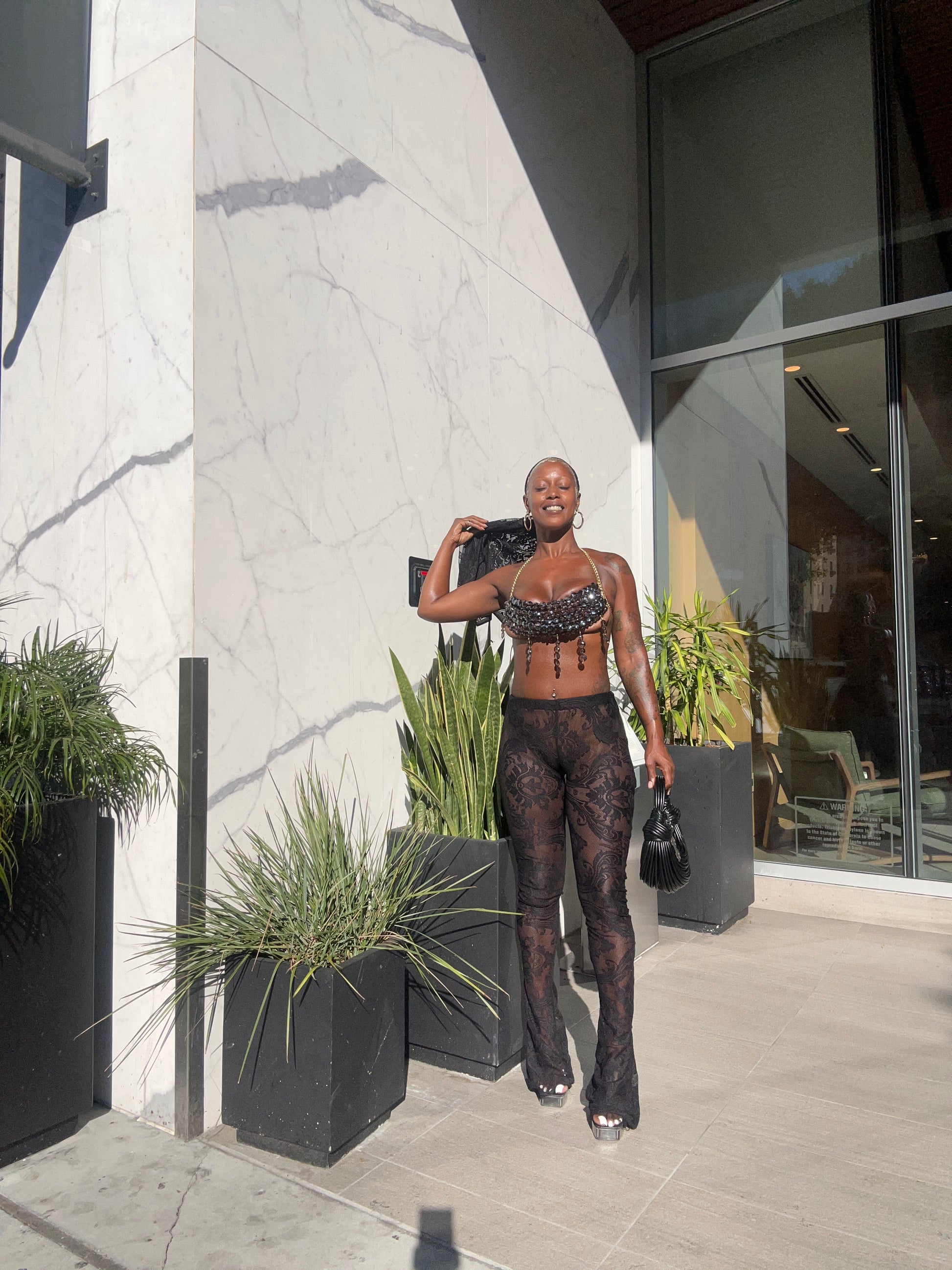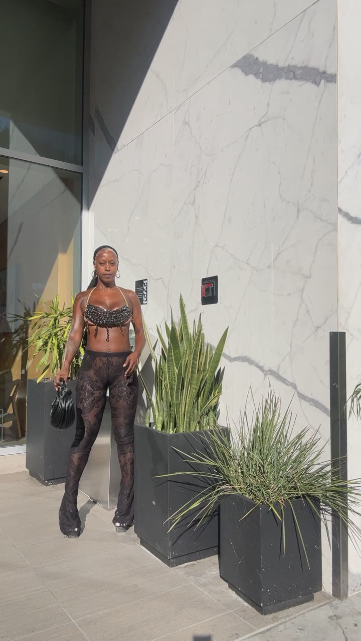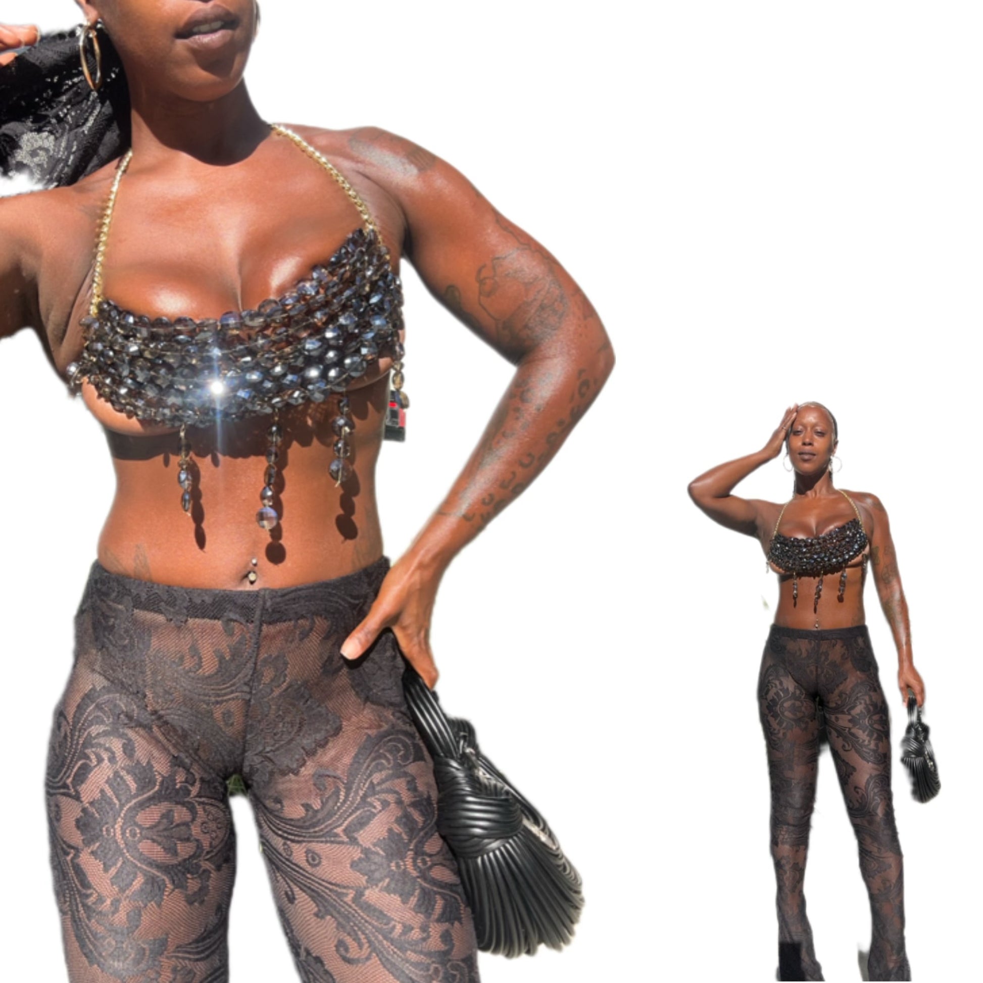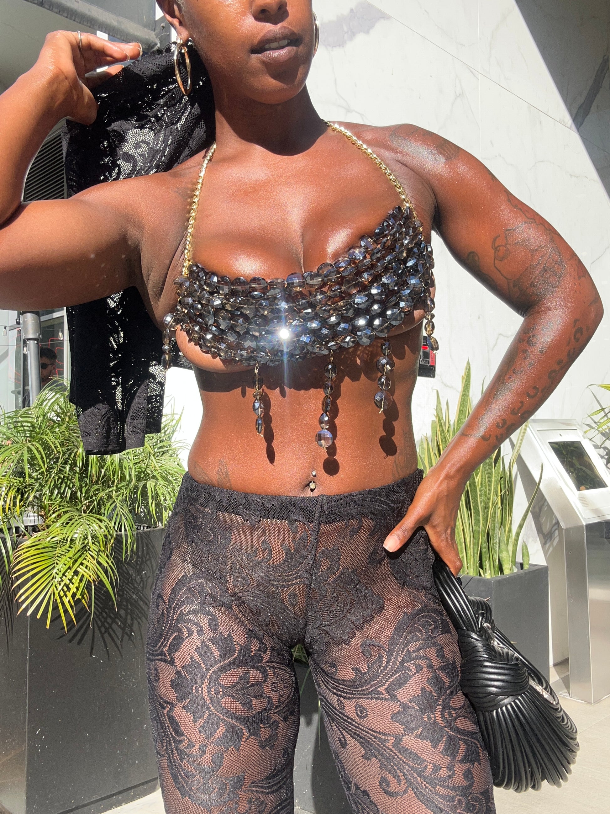 Additionally, several strands of beads or crystals hang down from the bottom edge of the top, adding movement and extra visual interest. This top is paired with black lace pants, creating a bold and stylish outfit. The overall look is glamorous and striking, suitable for a fashion-forward event or a night out.