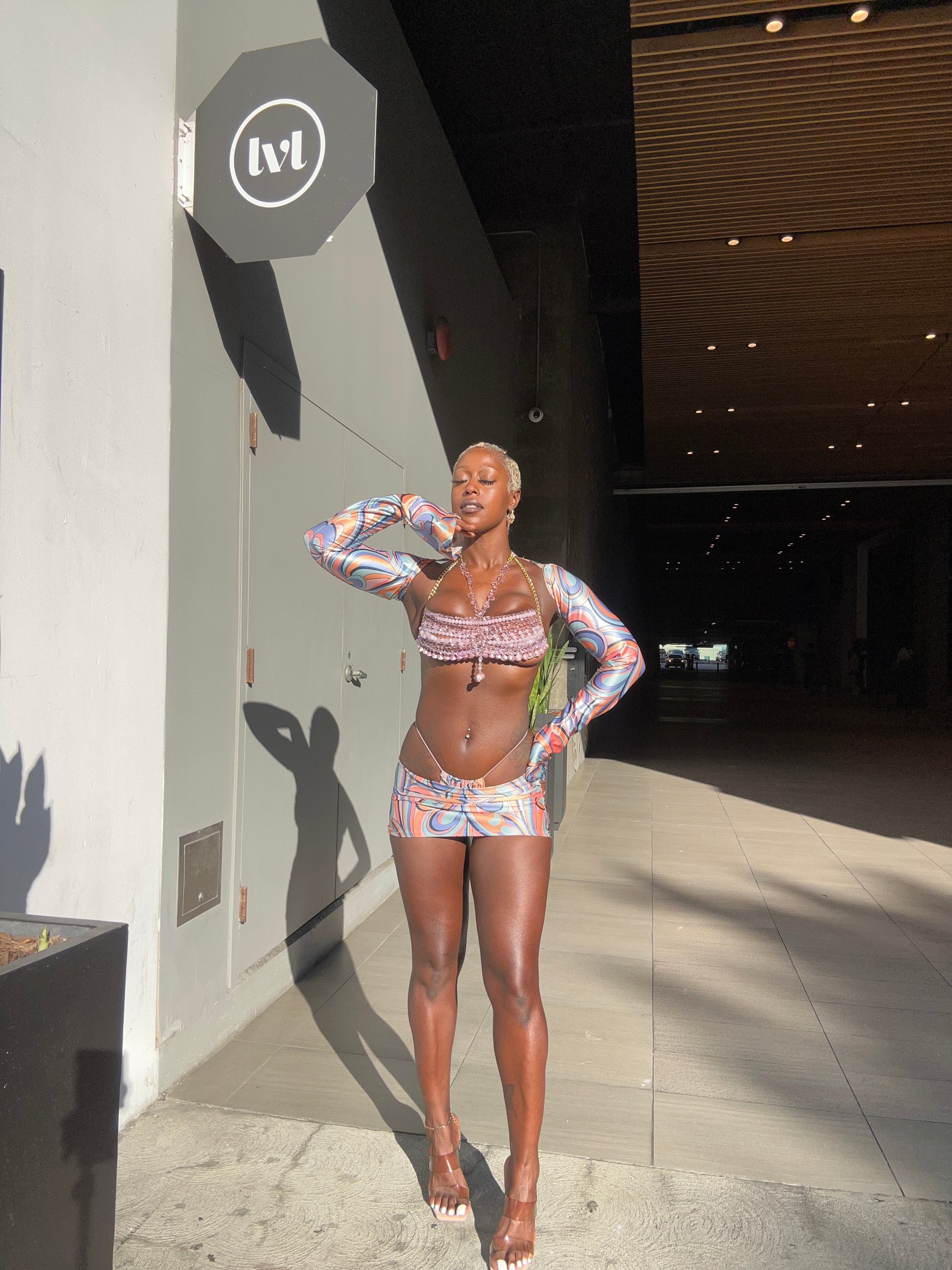 The top in this image is a striking, hand beaded bralette with a variety of soft pink hues, and features small pink seashells. the beads are strung together to form a halter-style bra that covers the bust area, with additional beaded fringe hanging down for extra detail. The top is supported by a gold chain that is adjustable and wraps around the neck and back, adding a touch of elegance and glamour. The soft pink hues of the beads gives it a more sophisticated, soft, feminine look. Model is wear a large.