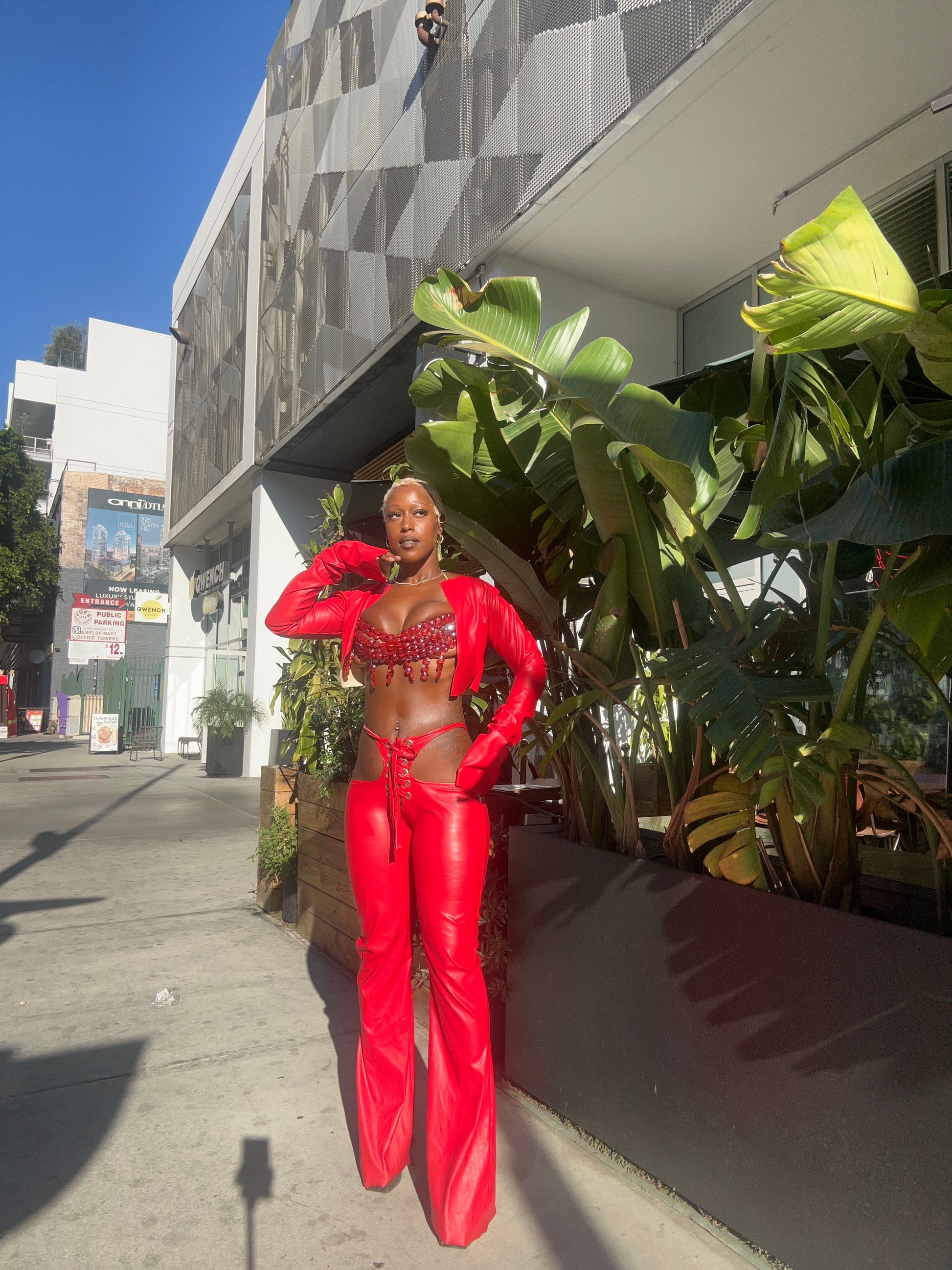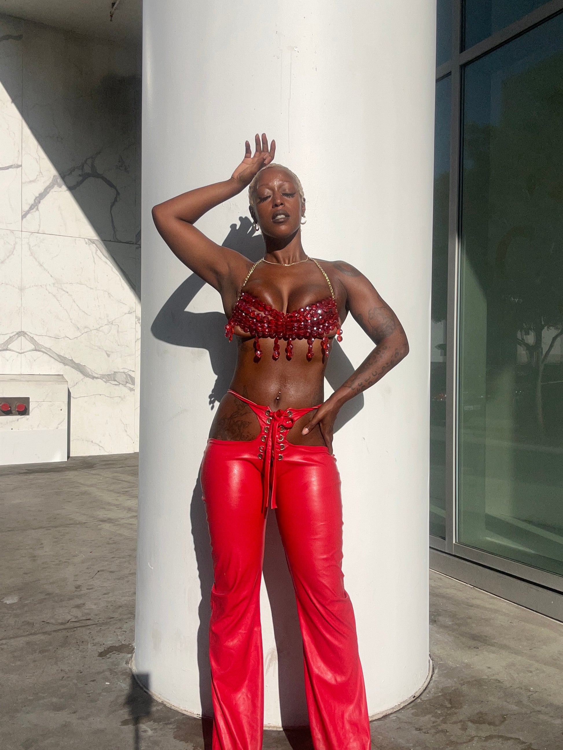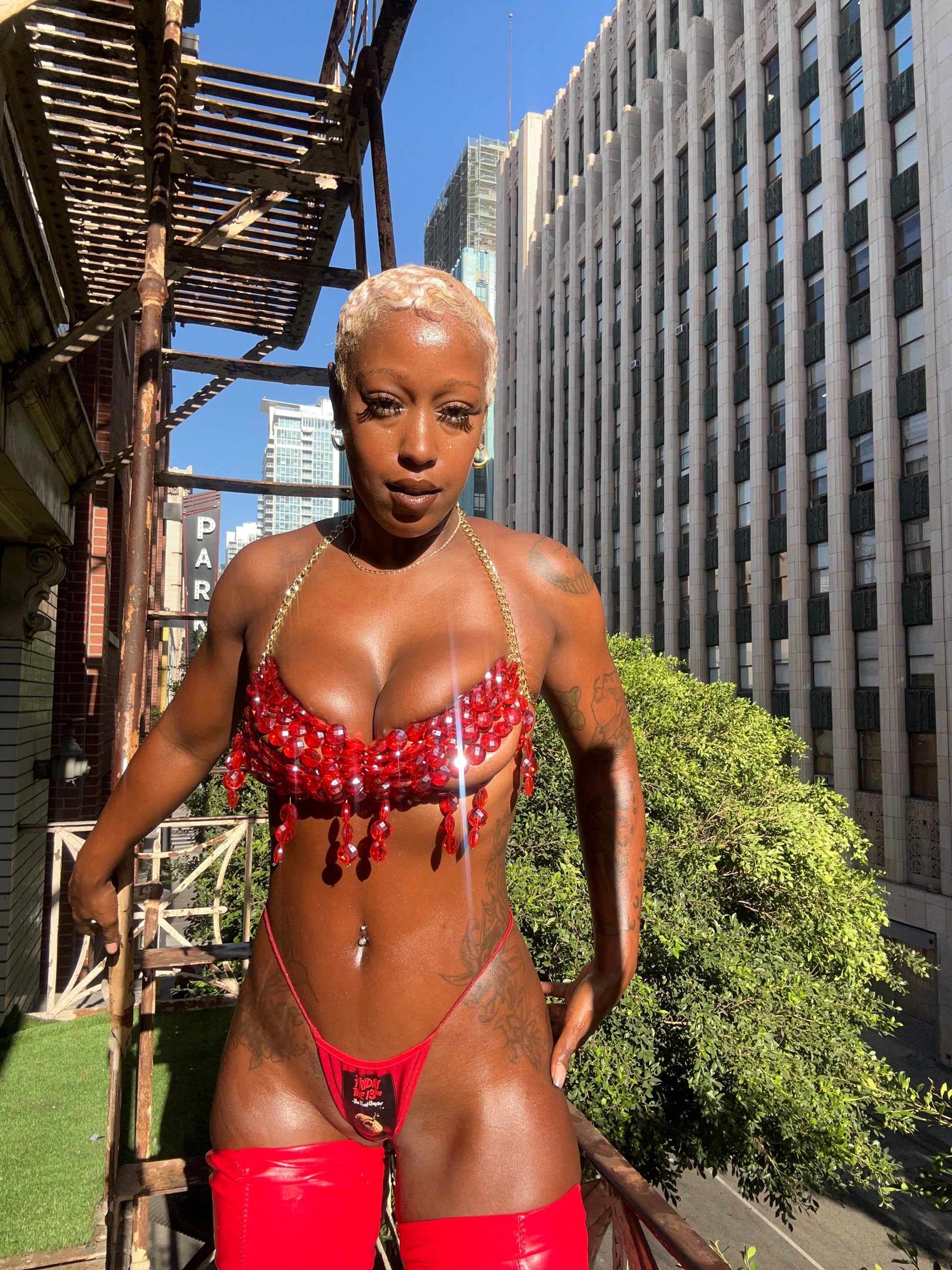 bold and unique halter style bralette crafted with red, jewel like glass beads. The beads are attached to gold chains that are adjustable and loop around the neck and back, adding a glamorous touch. The beads hang down in a fringe, creating a sparkling, eye-catching effect as they cascade down the front. Perfect for a birthday, festival, or any celebration where you want to shine brig her like a diamond. Model wearing medium.