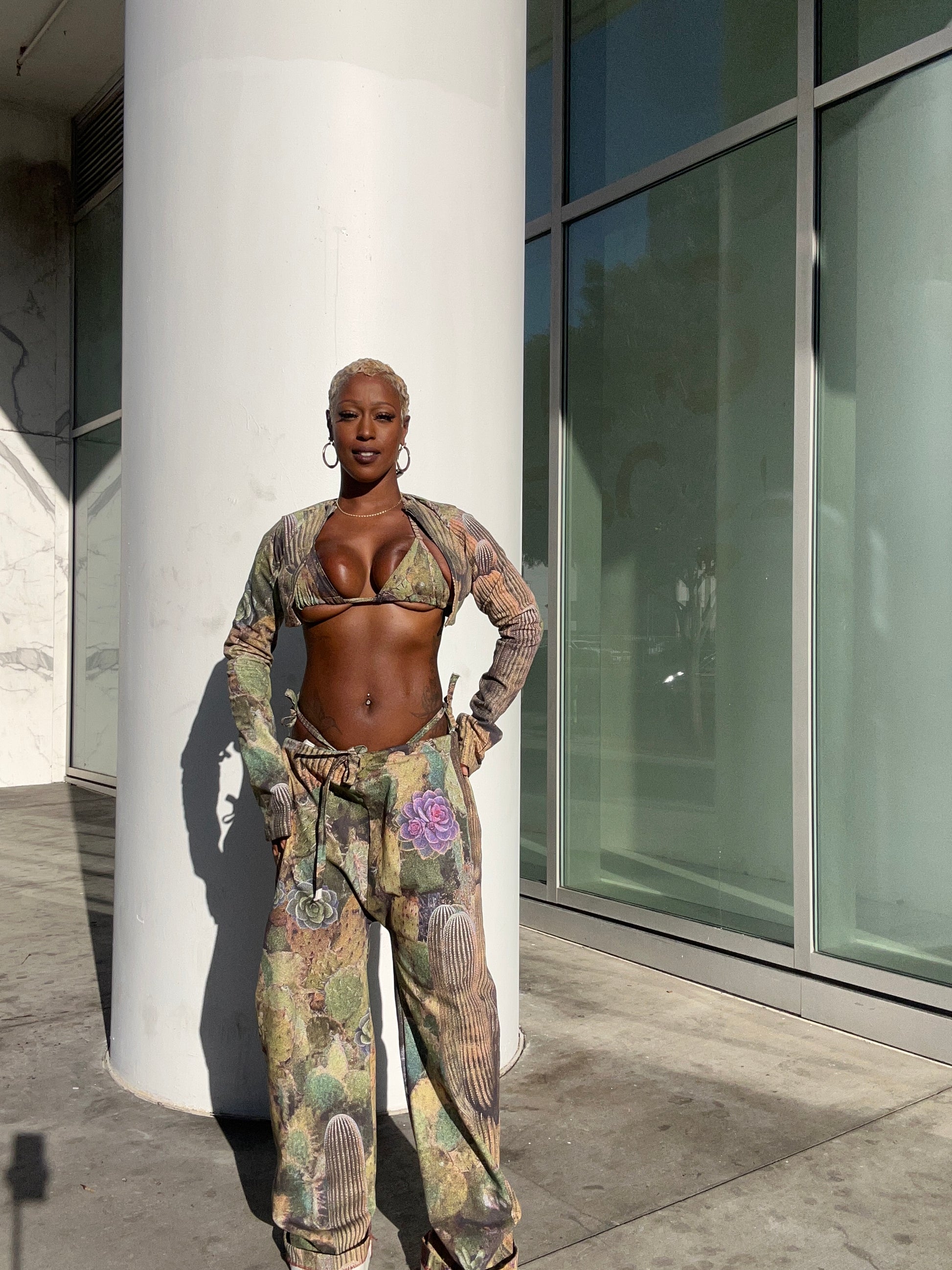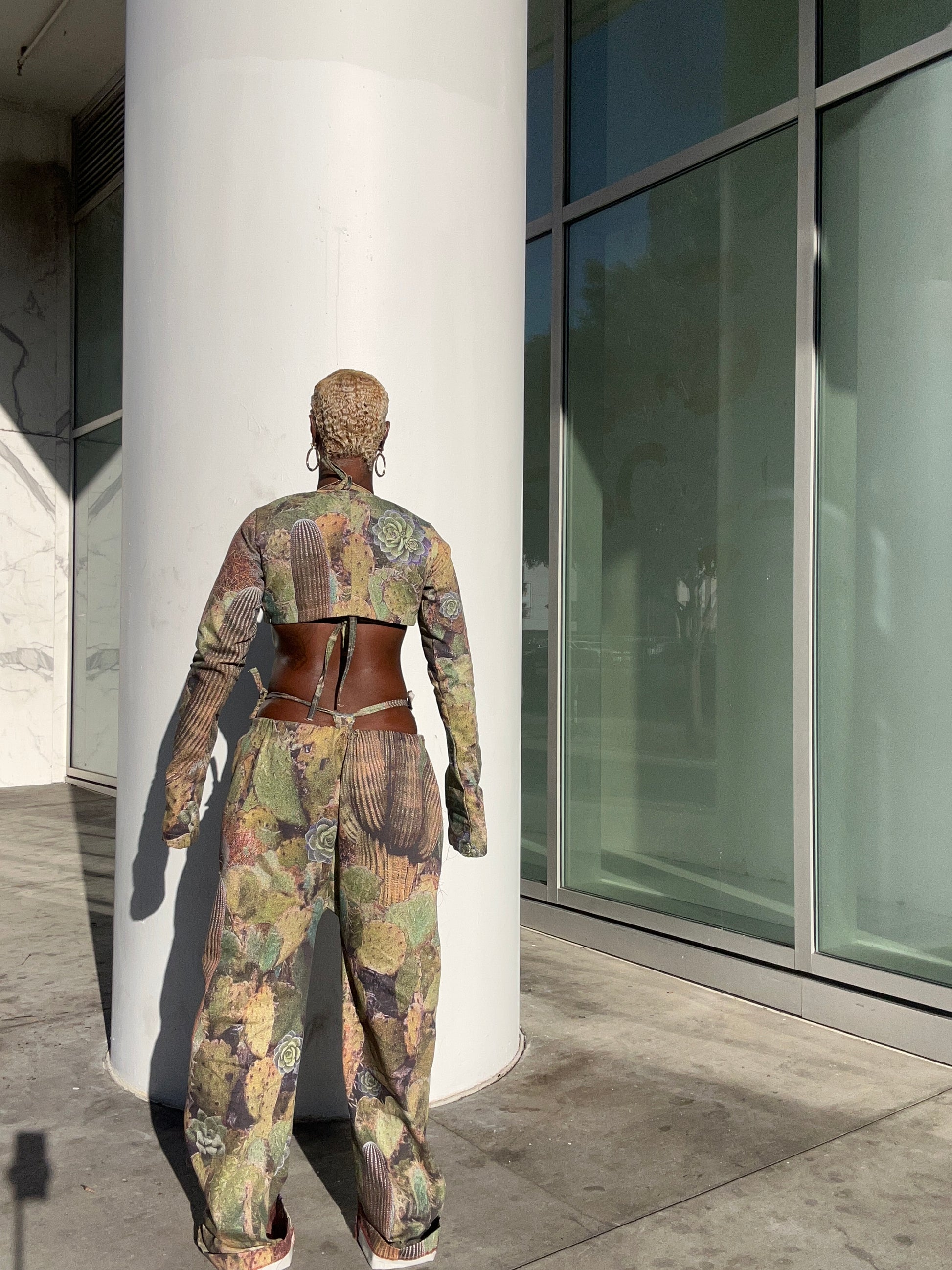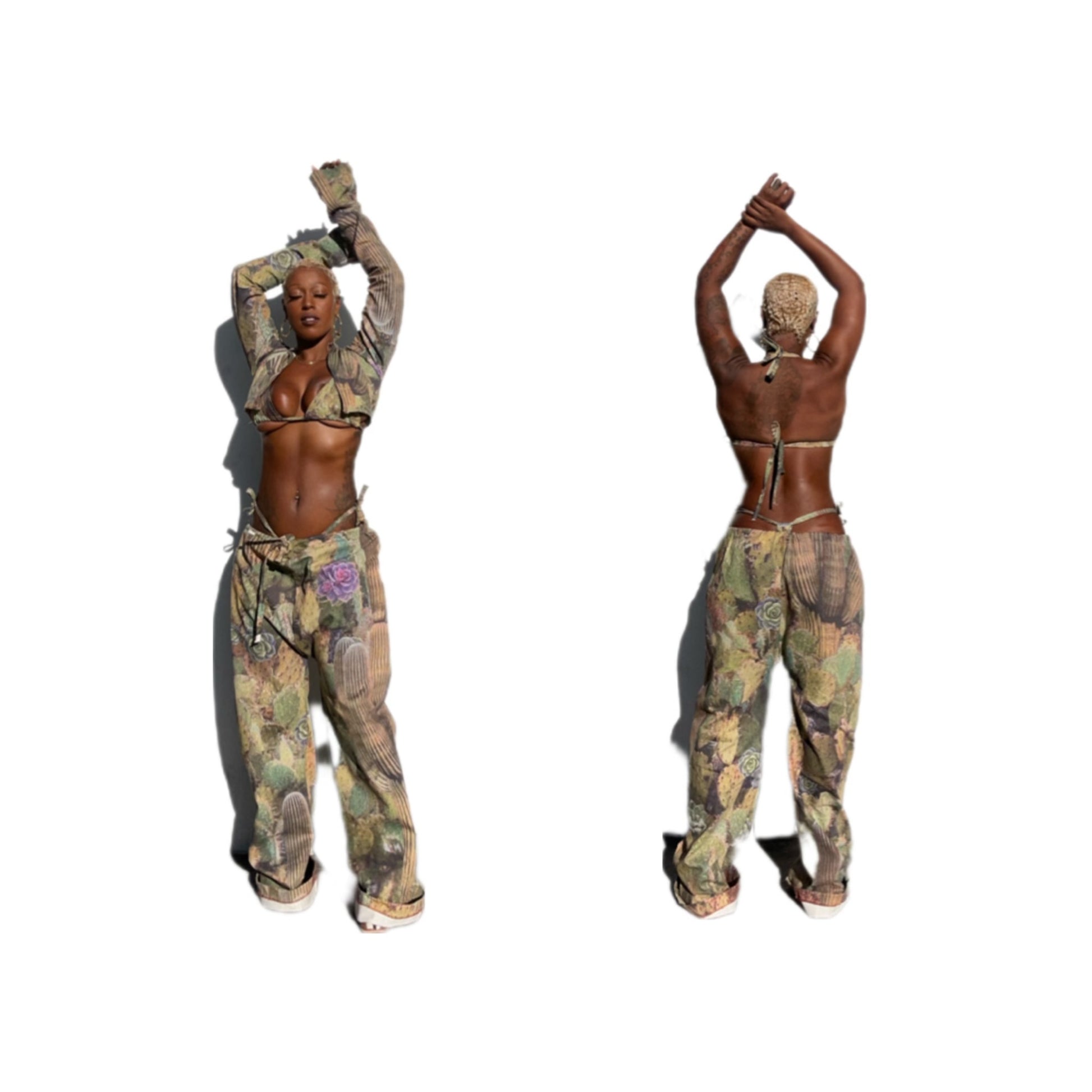 2 piece pants set with cropped jacket and pants that are loose-fitting with a drawstring waist and wide legs, featuring a unique cactus print with floral accents. The earthy tones and natural imagery give the outfit a bold, edgy, yet grounded look. Model Wearing medium pants small jacket