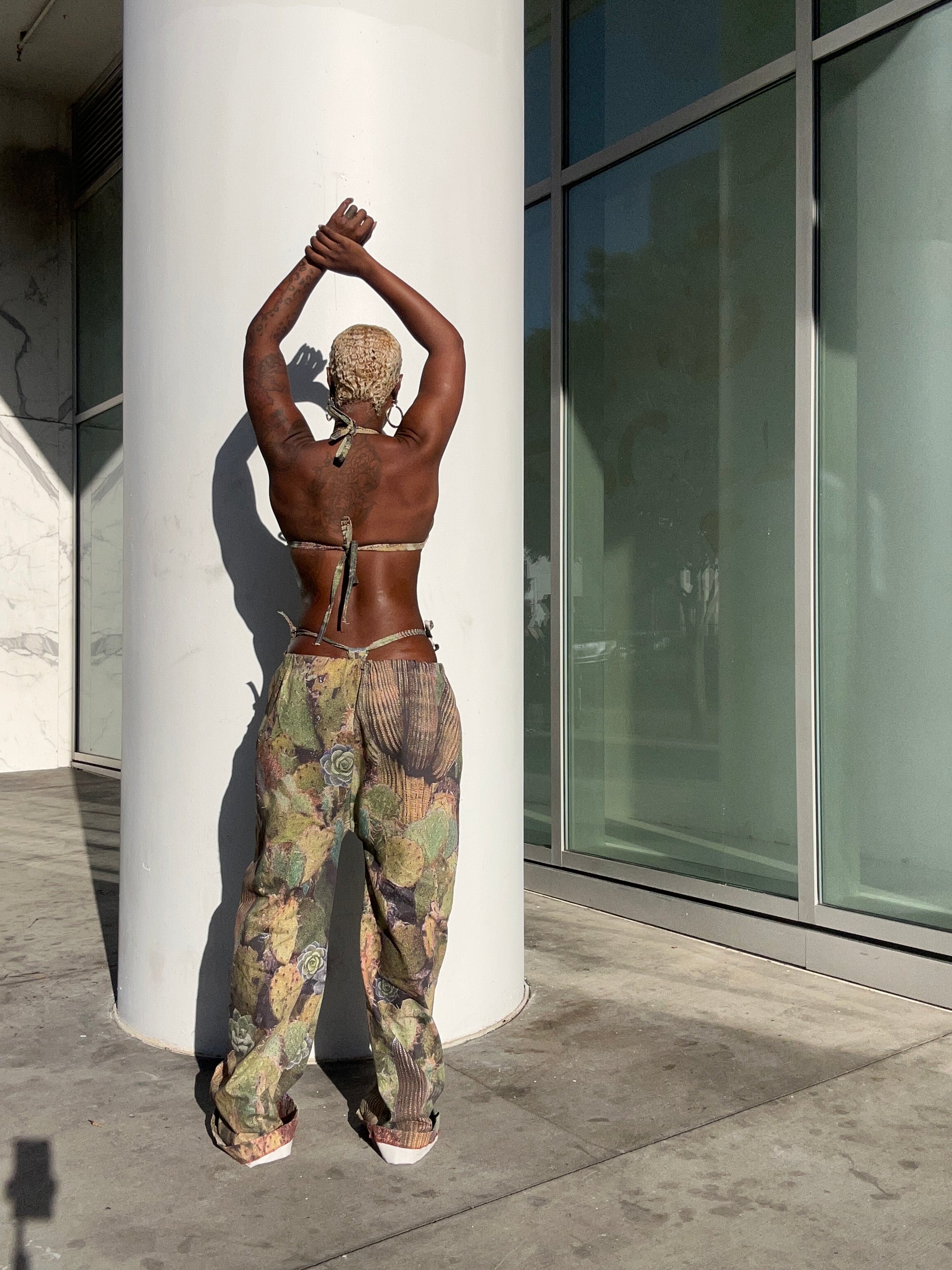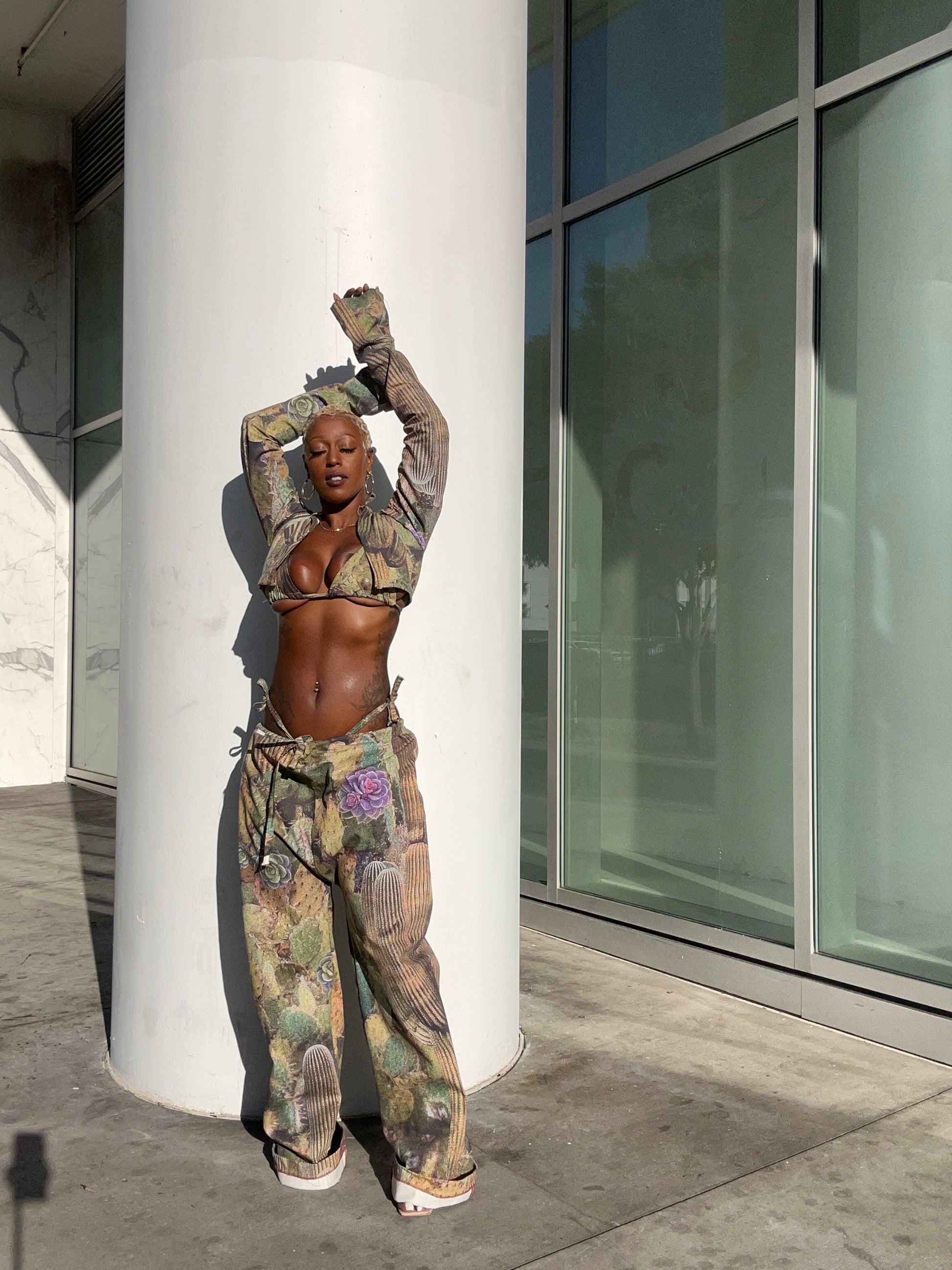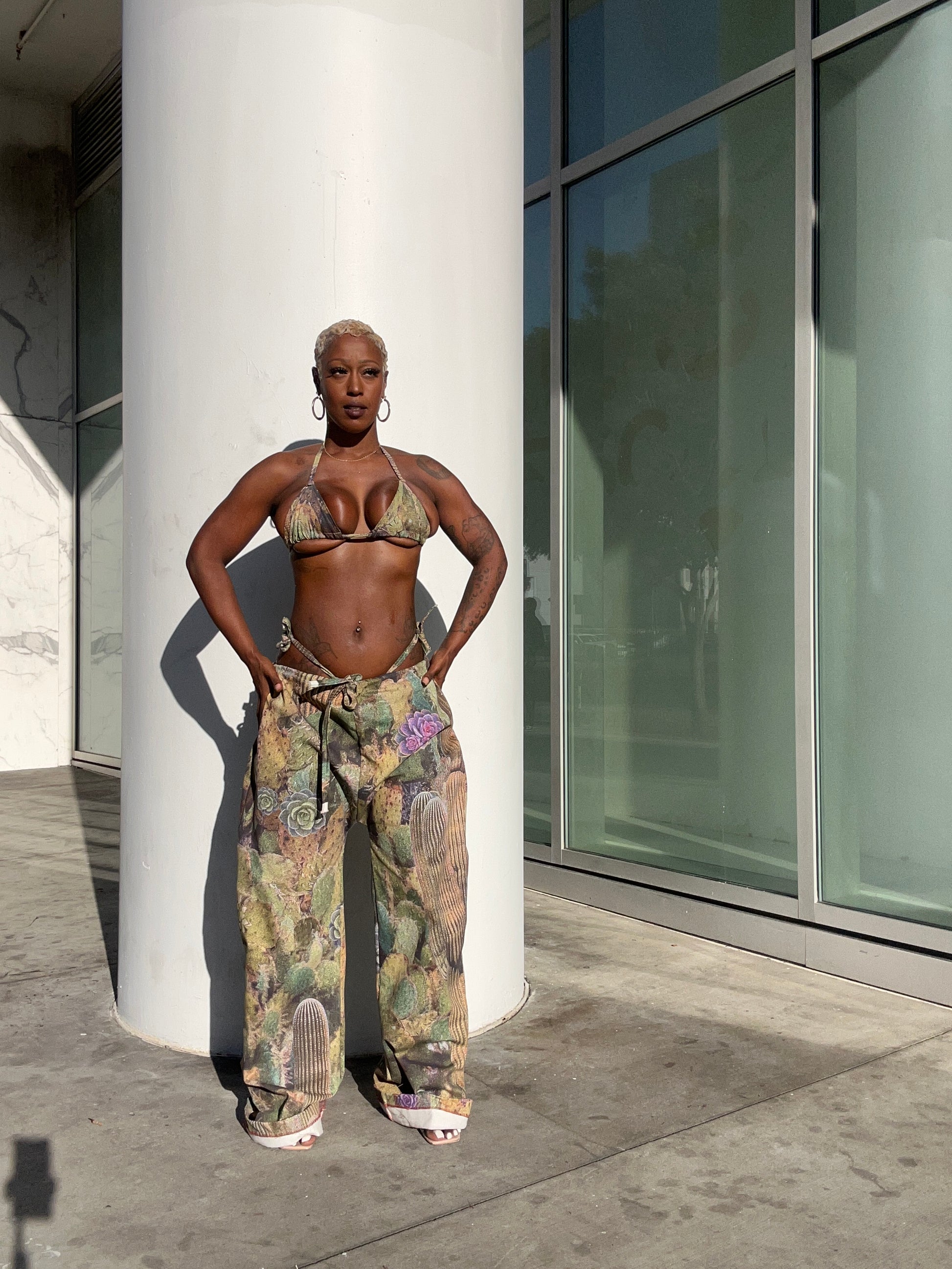 2 piece pants set with cropped jacket and pants that are loose-fitting with a drawstring waist and wide legs, featuring a unique cactus print with floral accents. The earthy tones and natural imagery give the outfit a bold, edgy, yet grounded look. Model Wearing medium pants small jacket