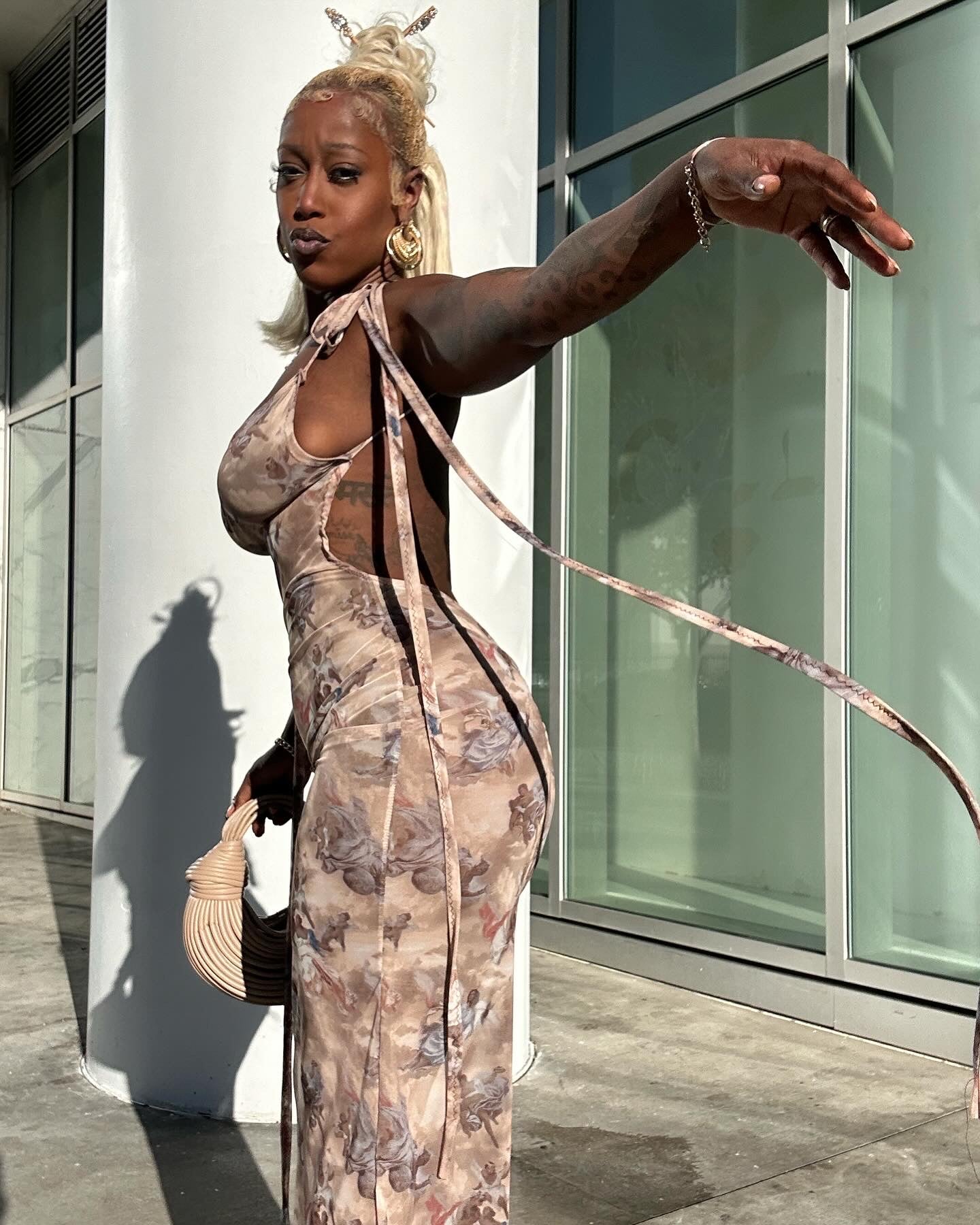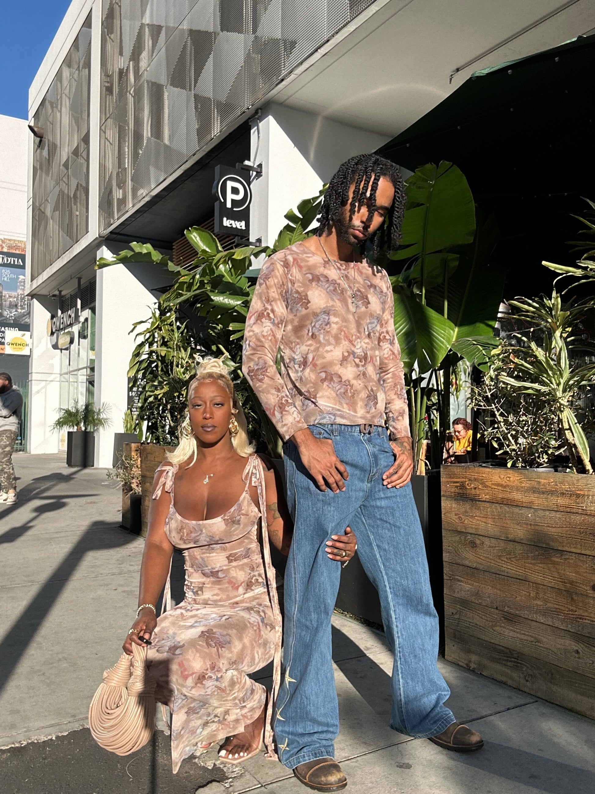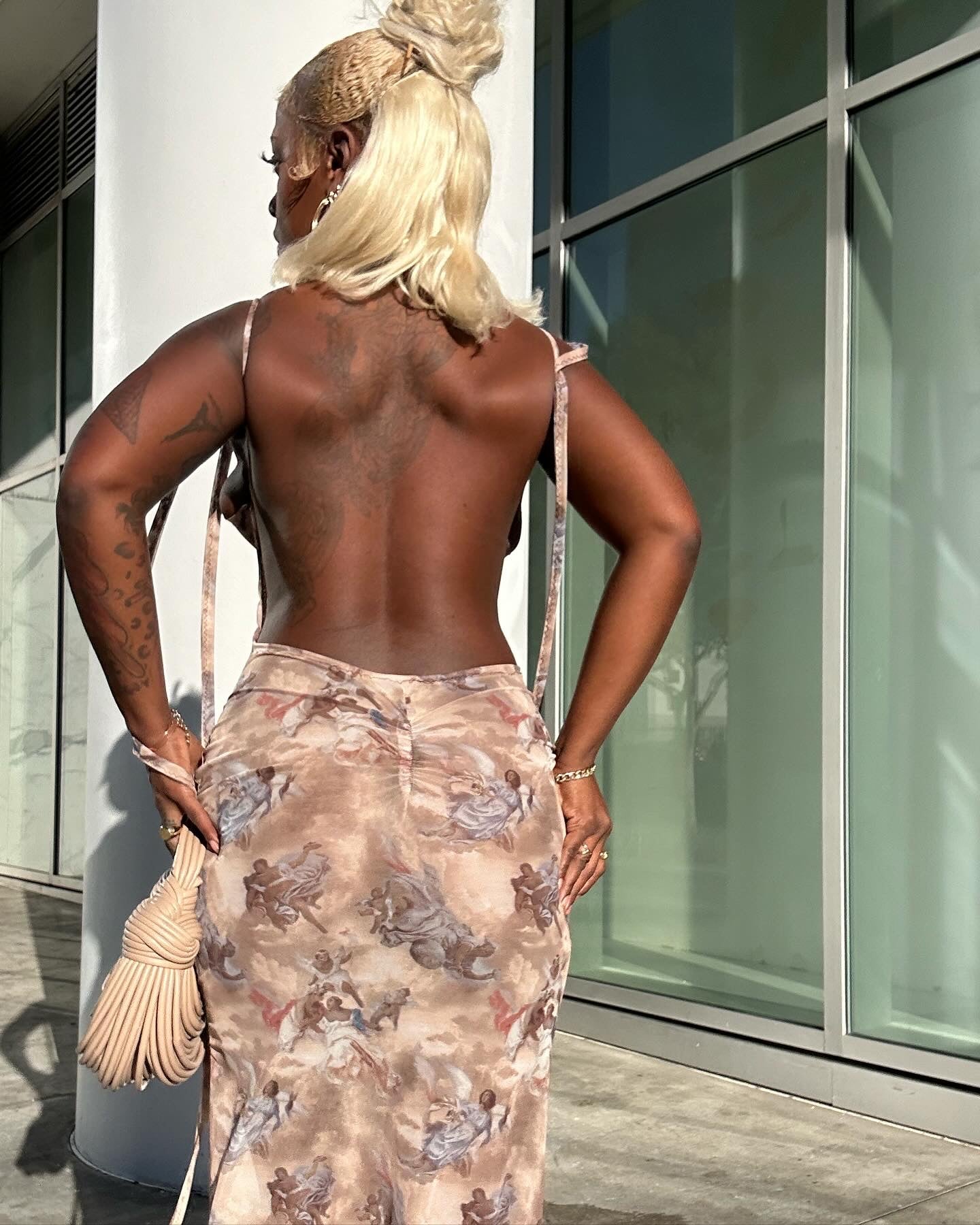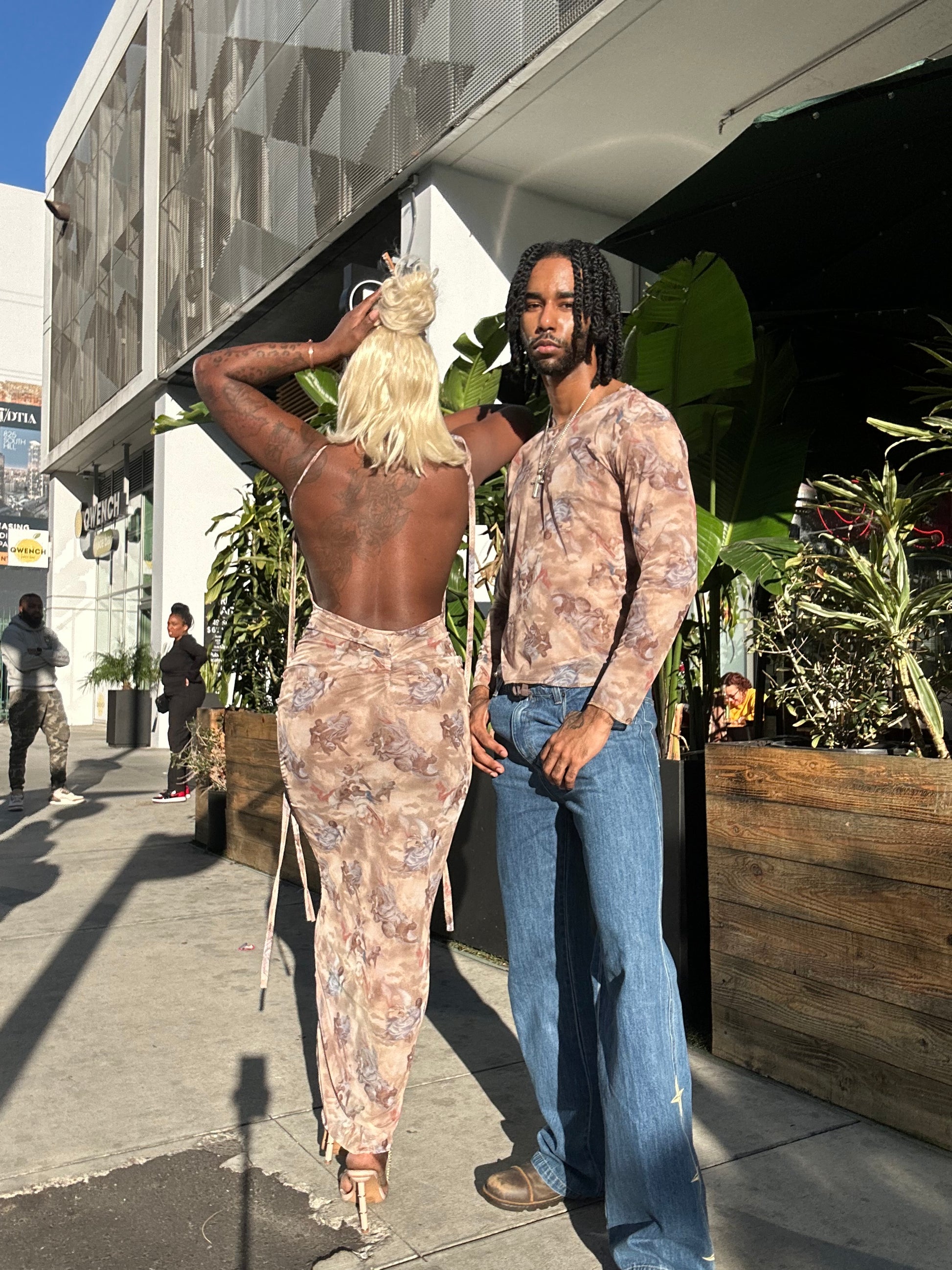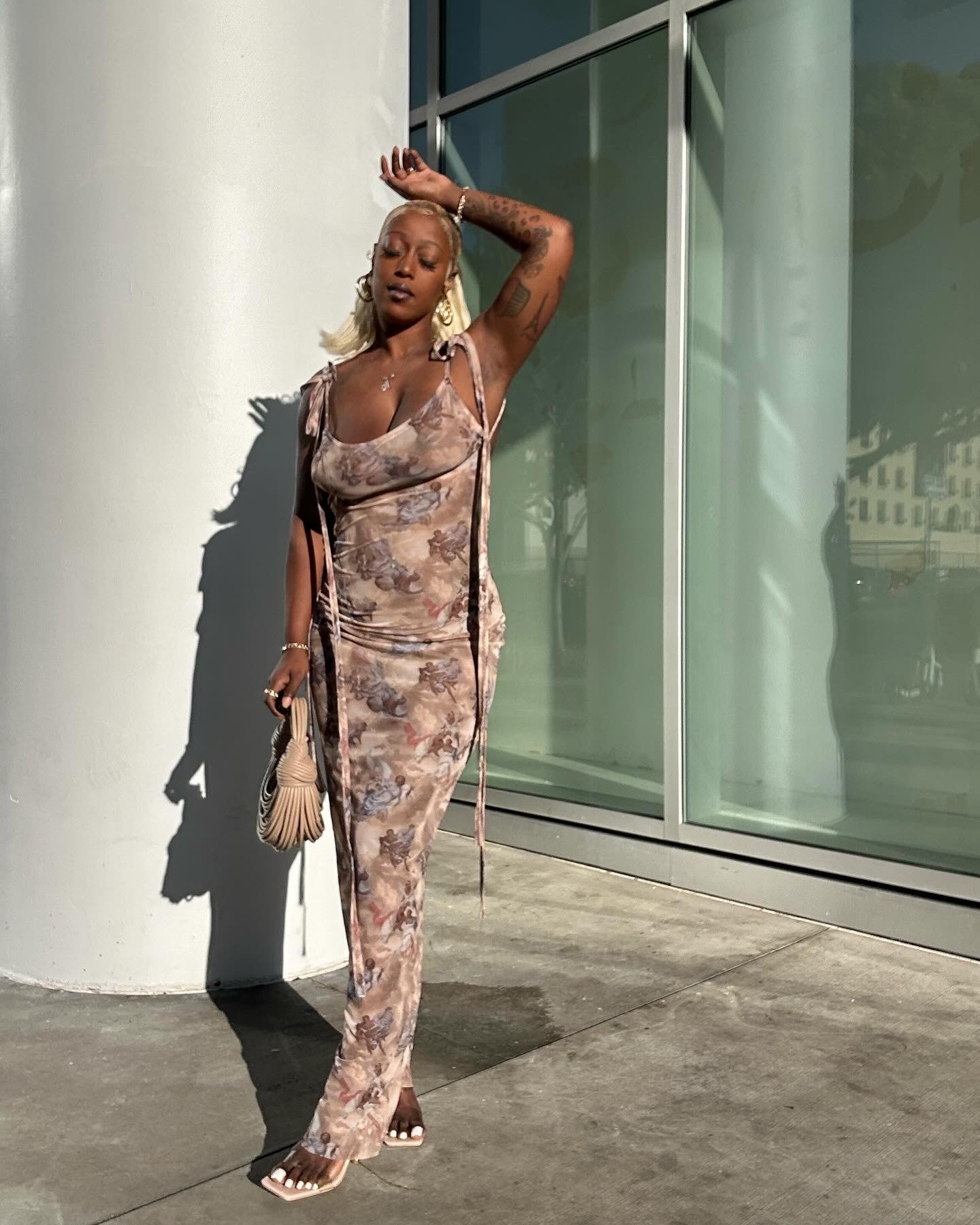 Mesh fabric with tan clouds and brown angels all over. Dress can be tied two different ways: backless or halter style. Model wearing medium, 5’8”.