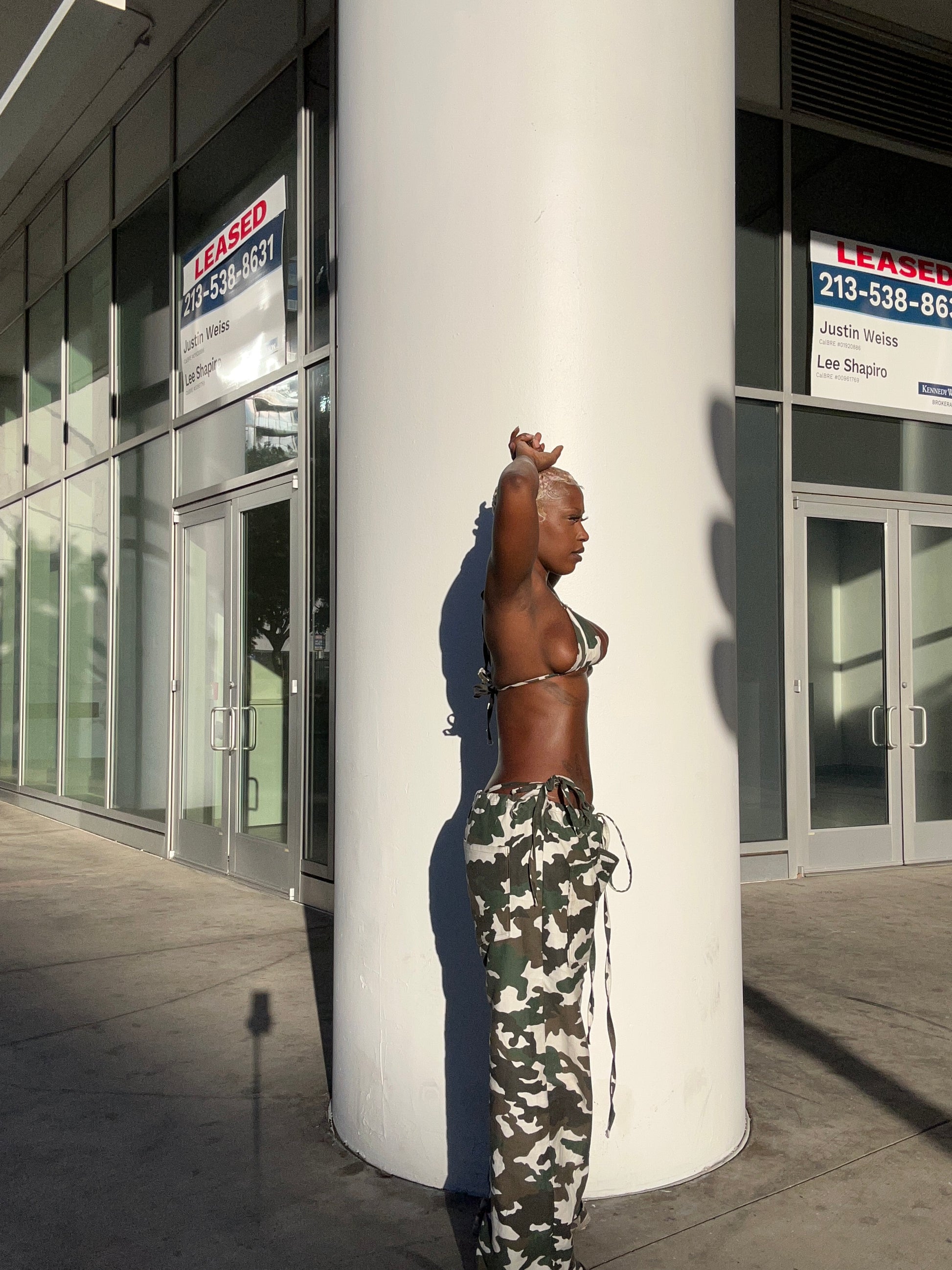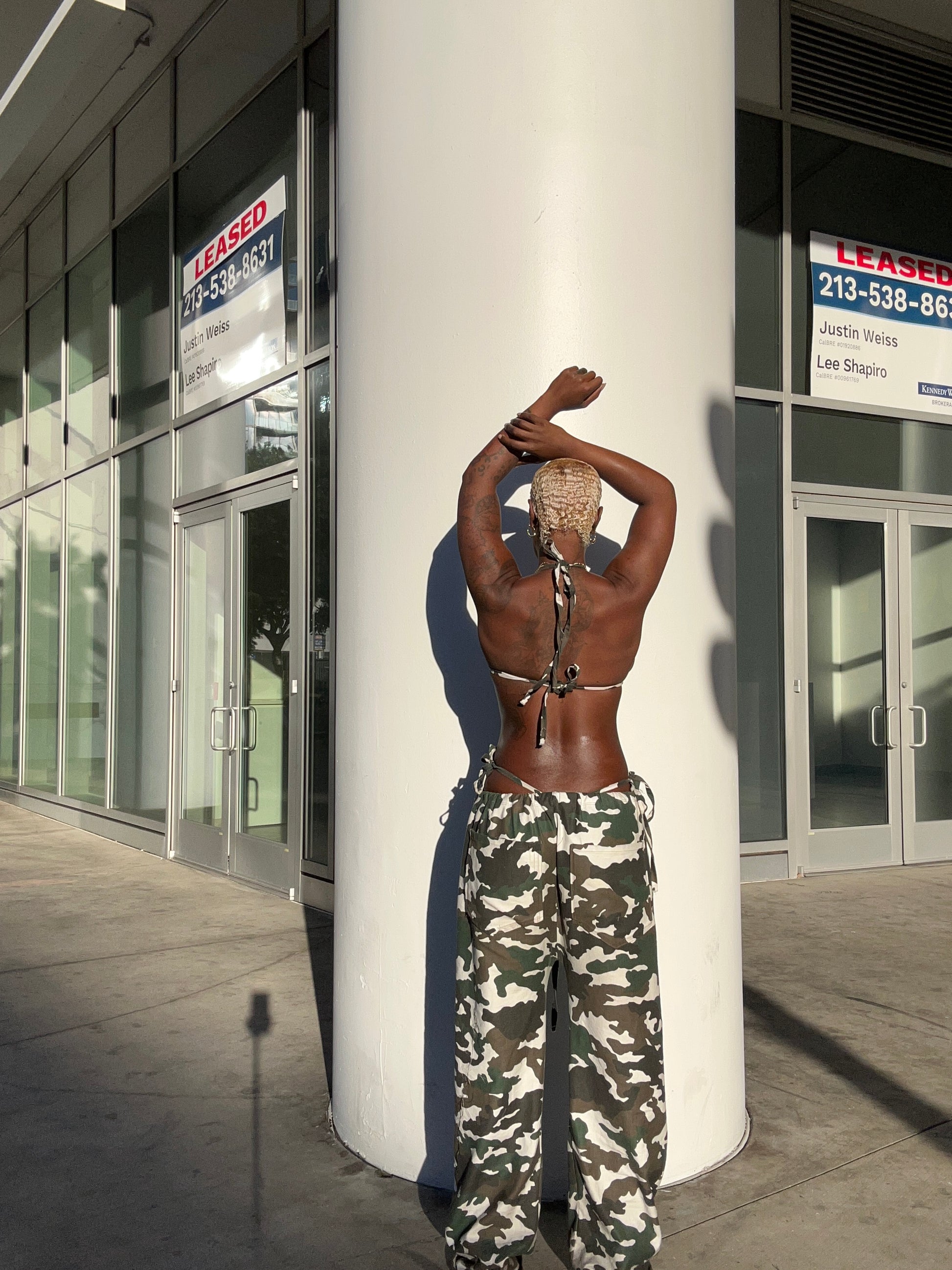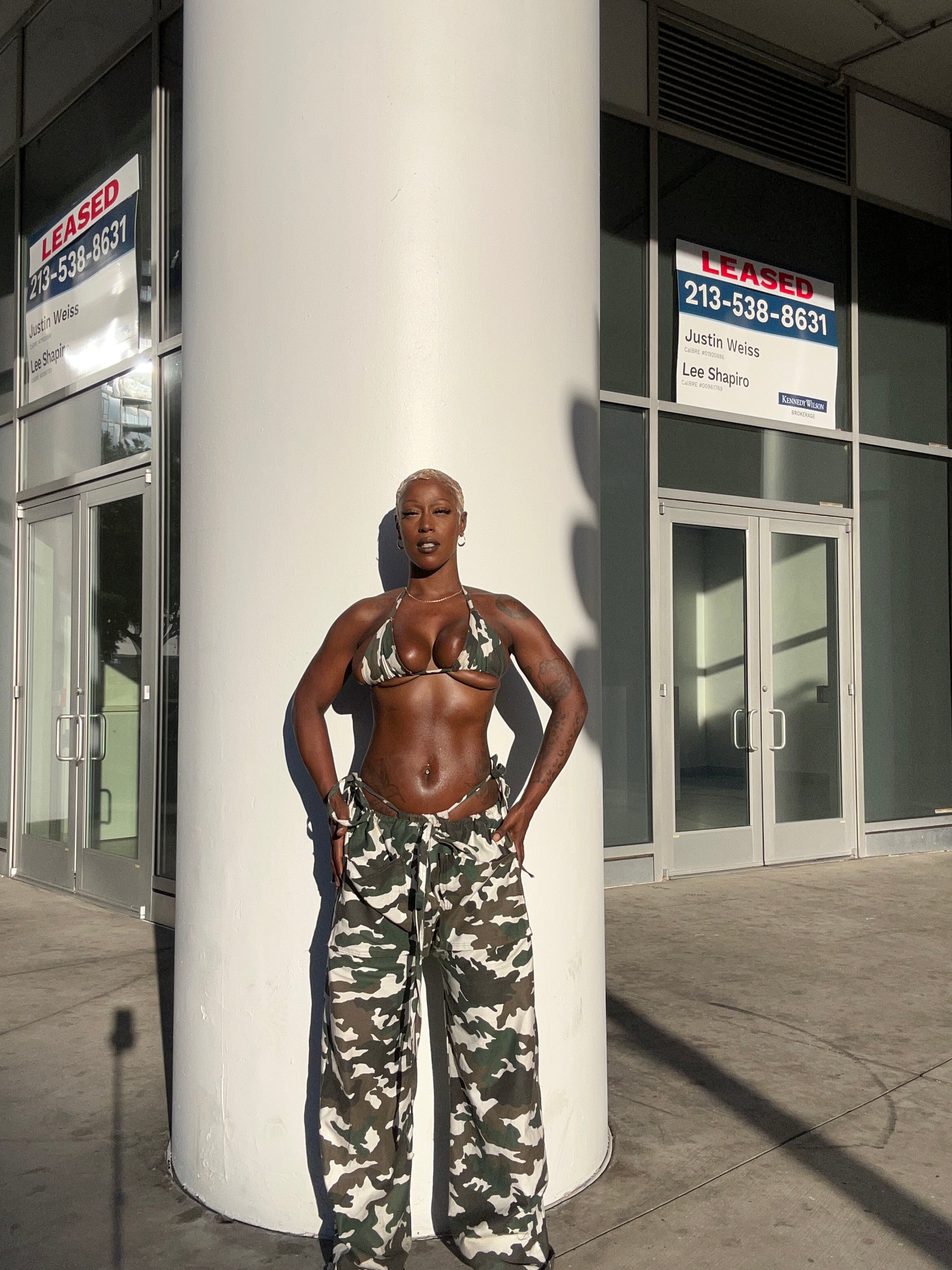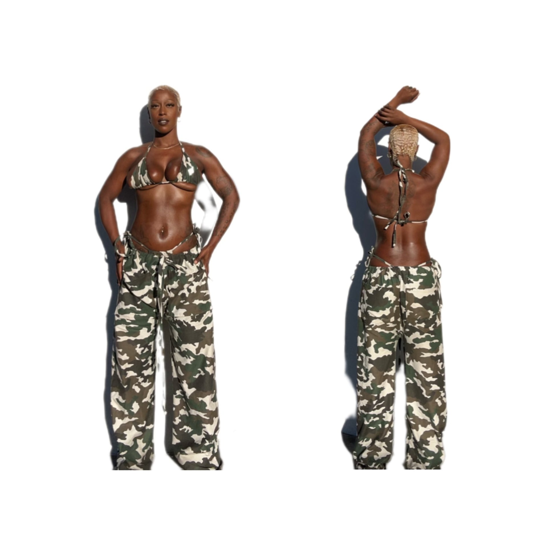 White, brown, and green loose-fitting camouflage pants with a drawstring at the waist and four large pockets. The outfit has a bold, urban, and military-inspired aesthetic, combining the utilitarian look of camouflage with a more revealing, fashionable street wear style.