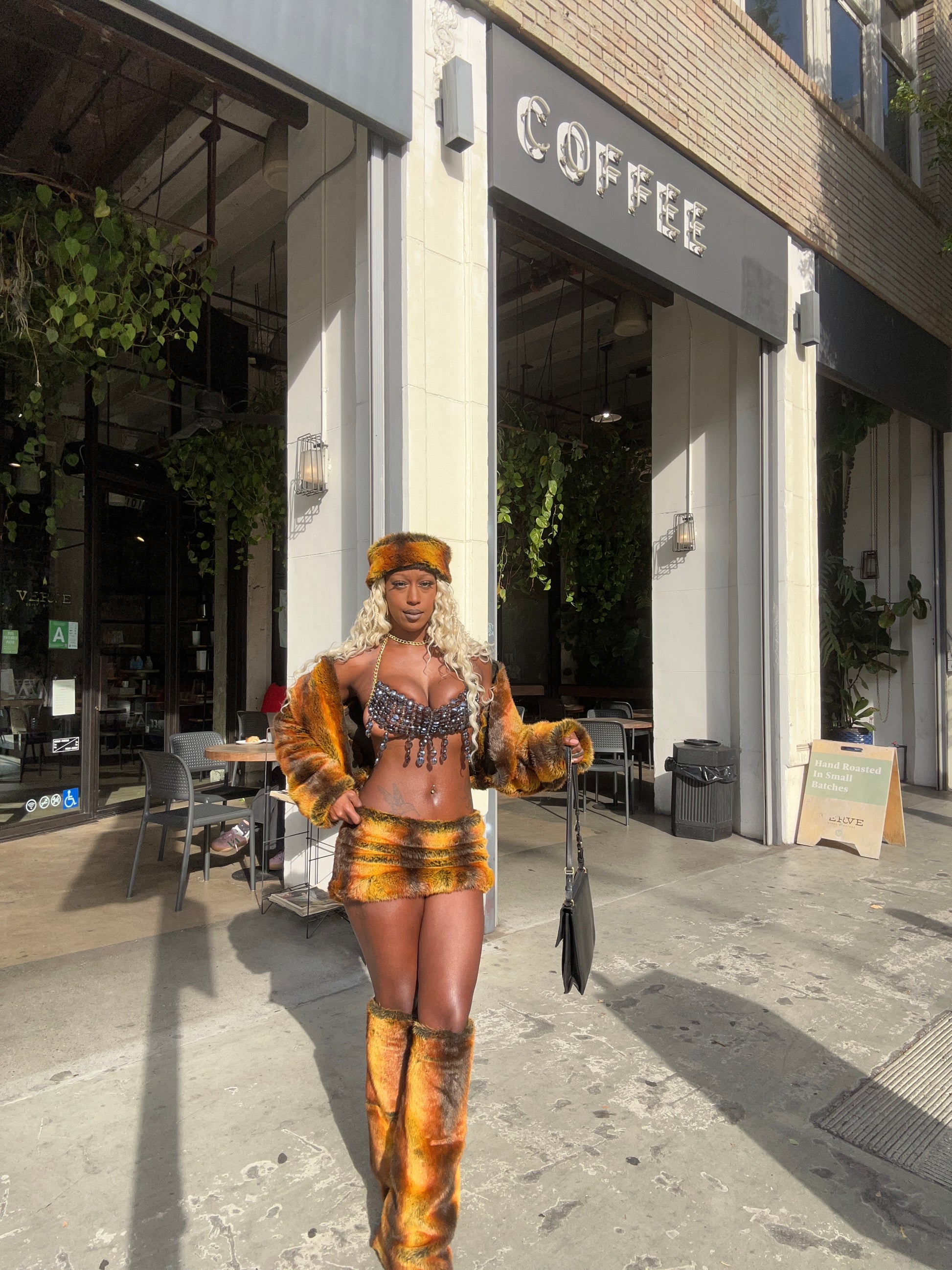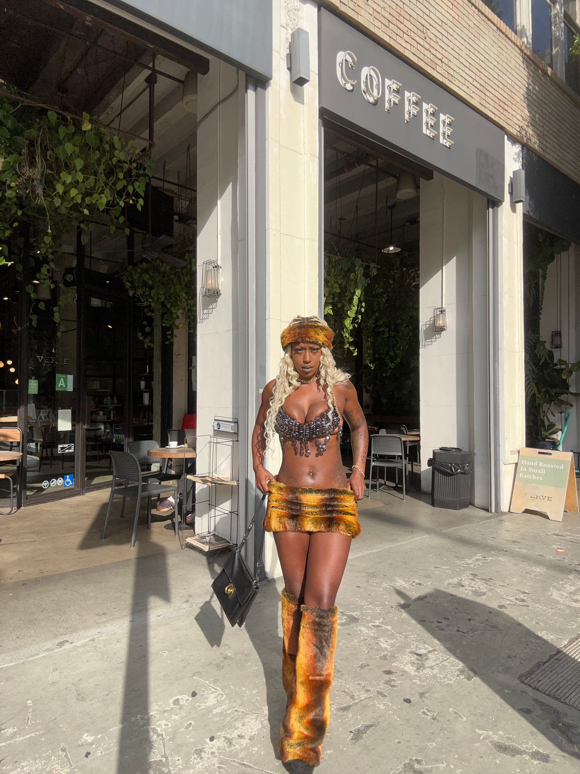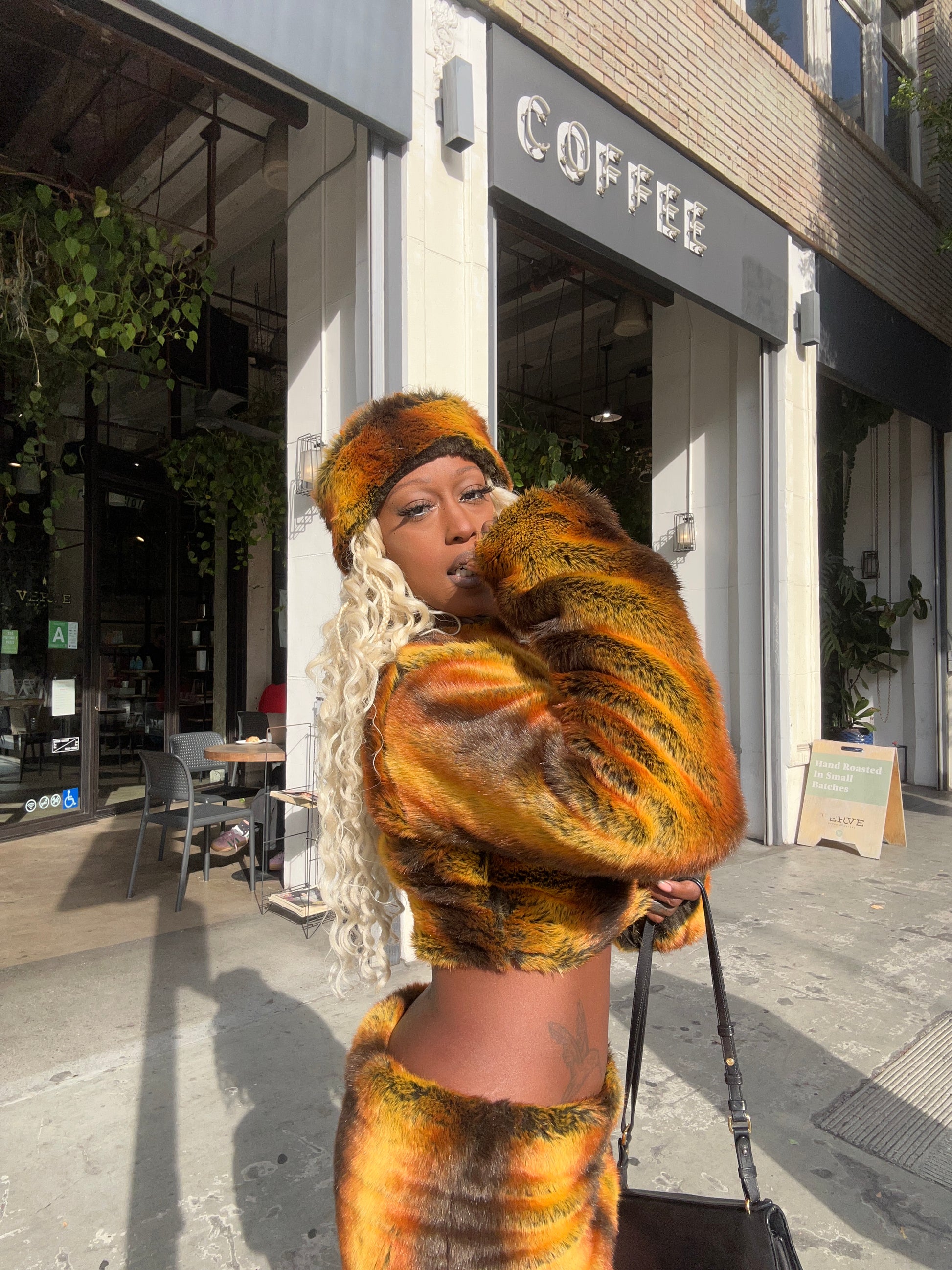 5 piece faux fur mini set that mimics mink fur. Set includes: Jacket, leg warmers, mini skirt, and headband. Items can be worn separately with other looks. Model wearing Medium. Does not stretch. Made to order.