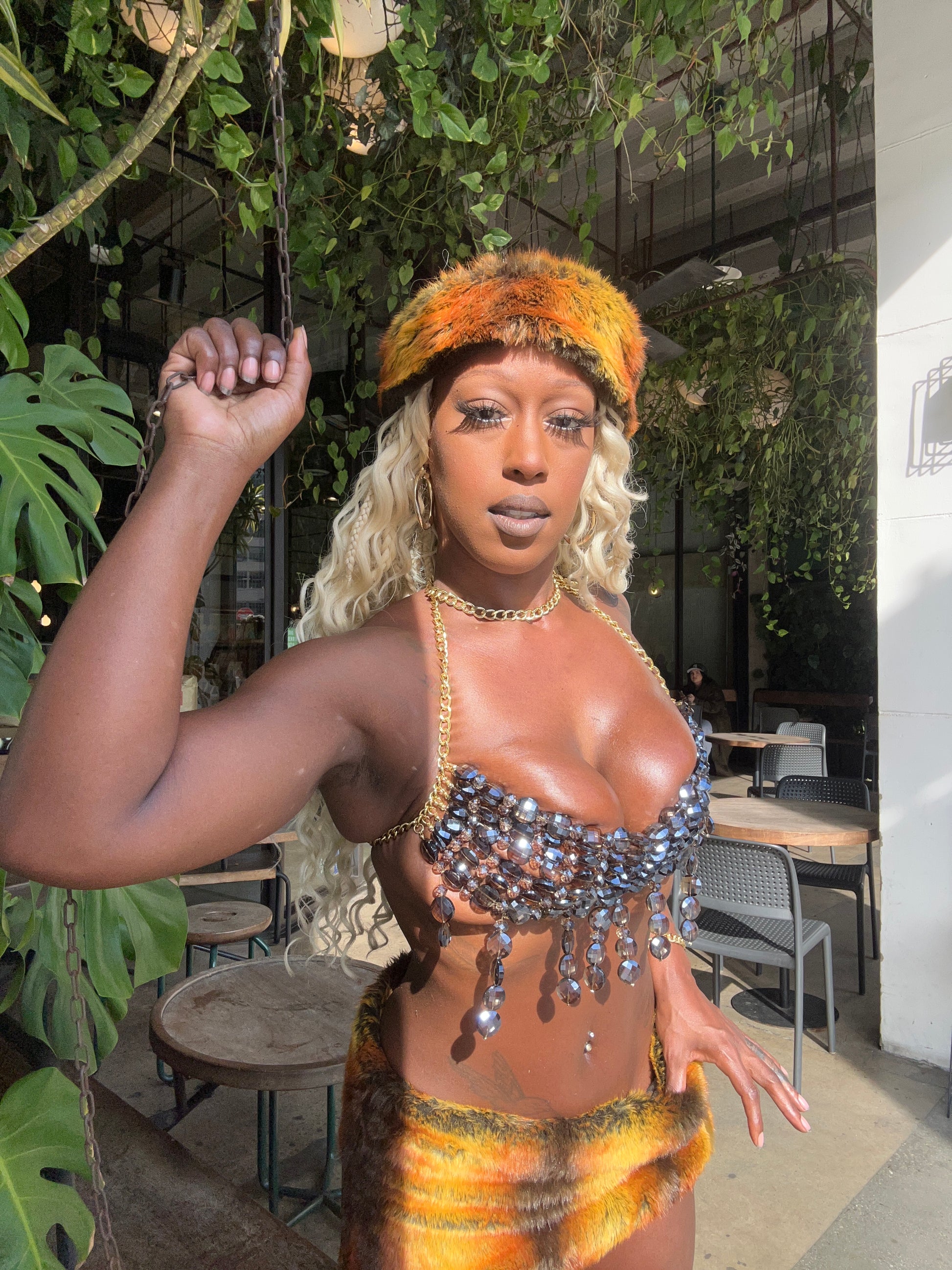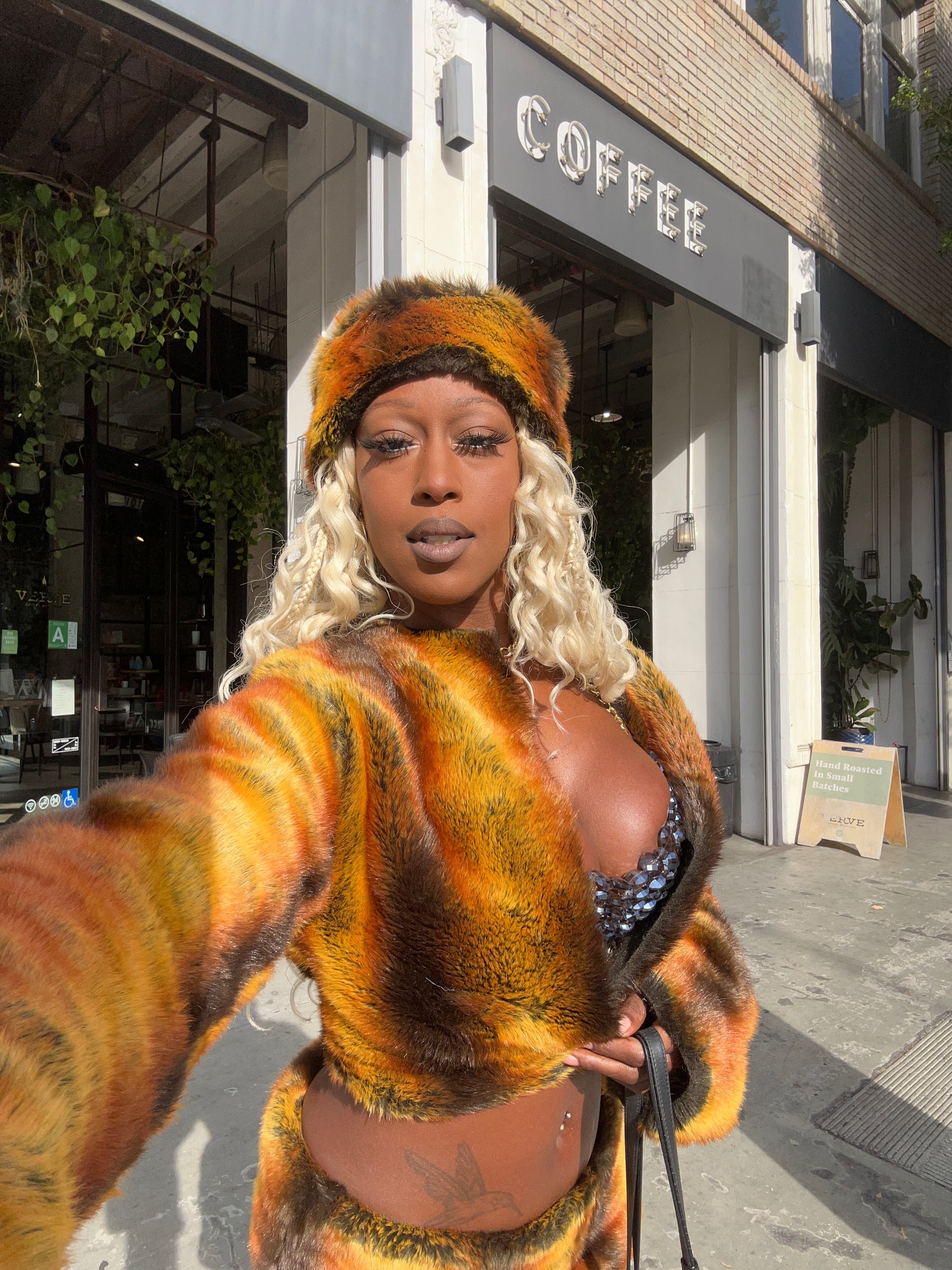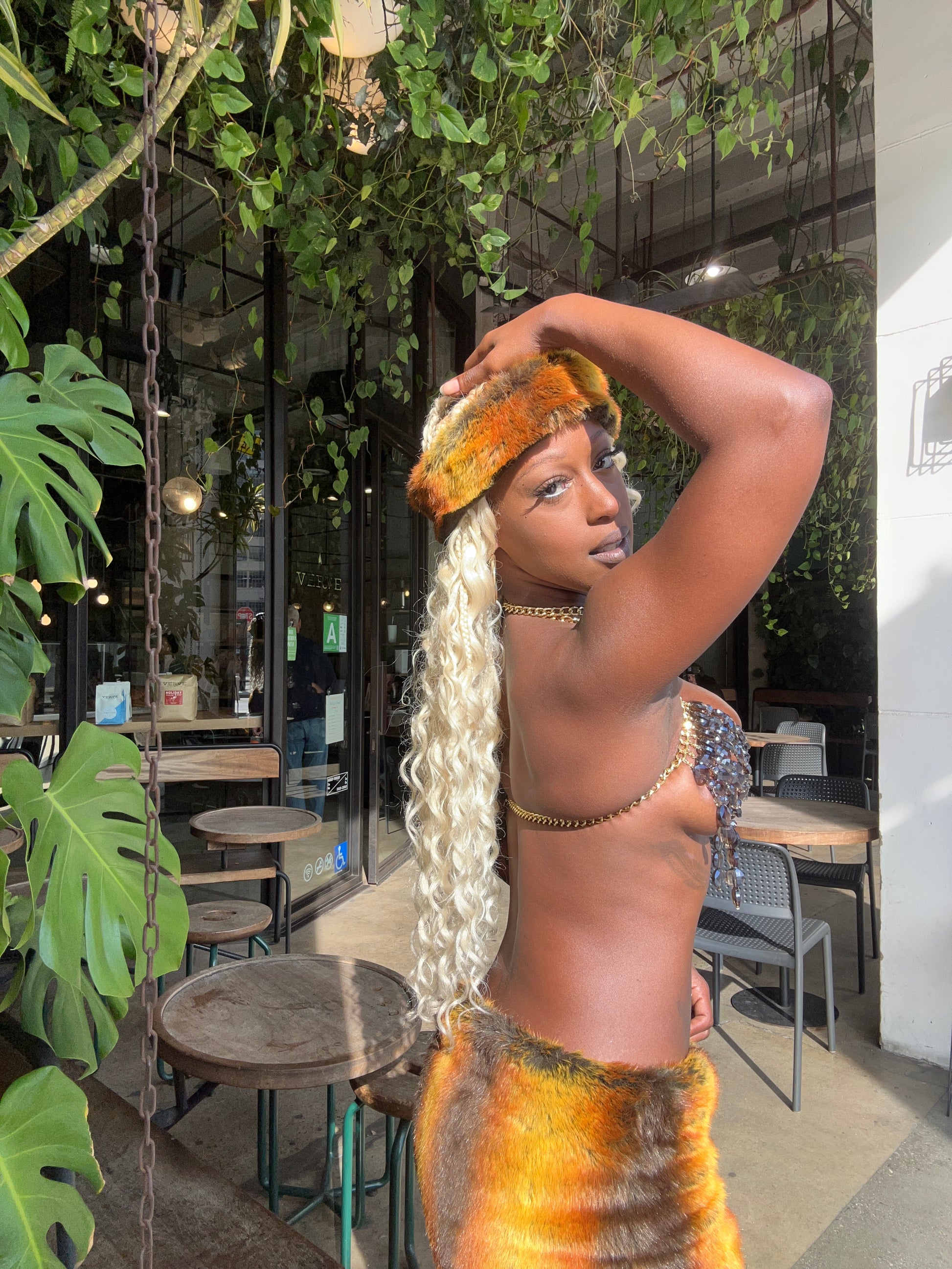 5 piece faux fur mini set that mimics mink fur. Set includes: Jacket, leg warmers, mini skirt, and headband. Items can be worn separately with other looks. Model wearing Medium. Does not stretch. Made to order.