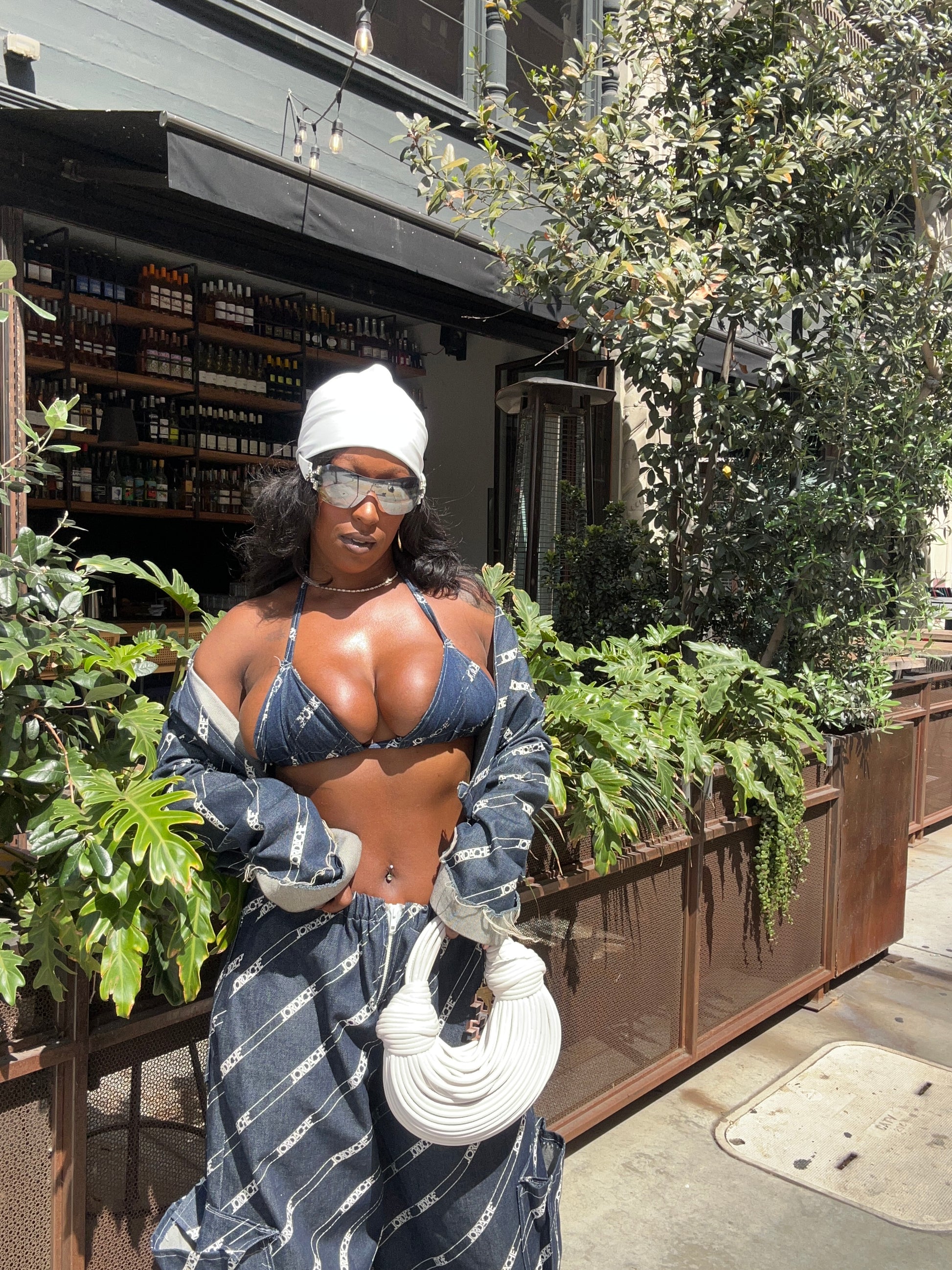 Turn heads in this bold reimagining of classic Jordache denim. Crafted from authentic vintage Jordache denim rolls, this set is all about statement style and modern edge. The matching pieces feature the Jordache logo printed throughout, bringing nostalgic streetwear energy with a high-fashion twist.