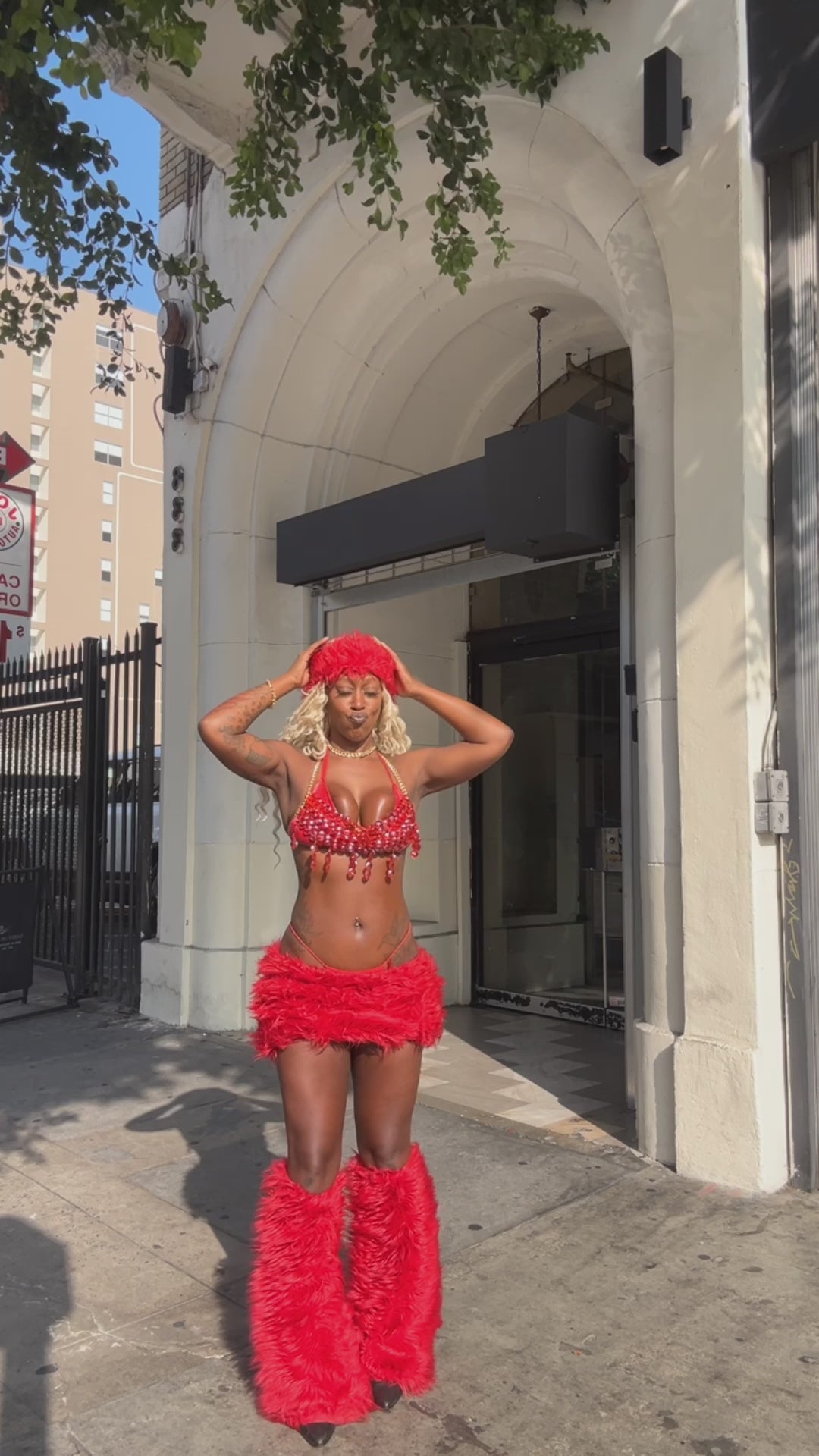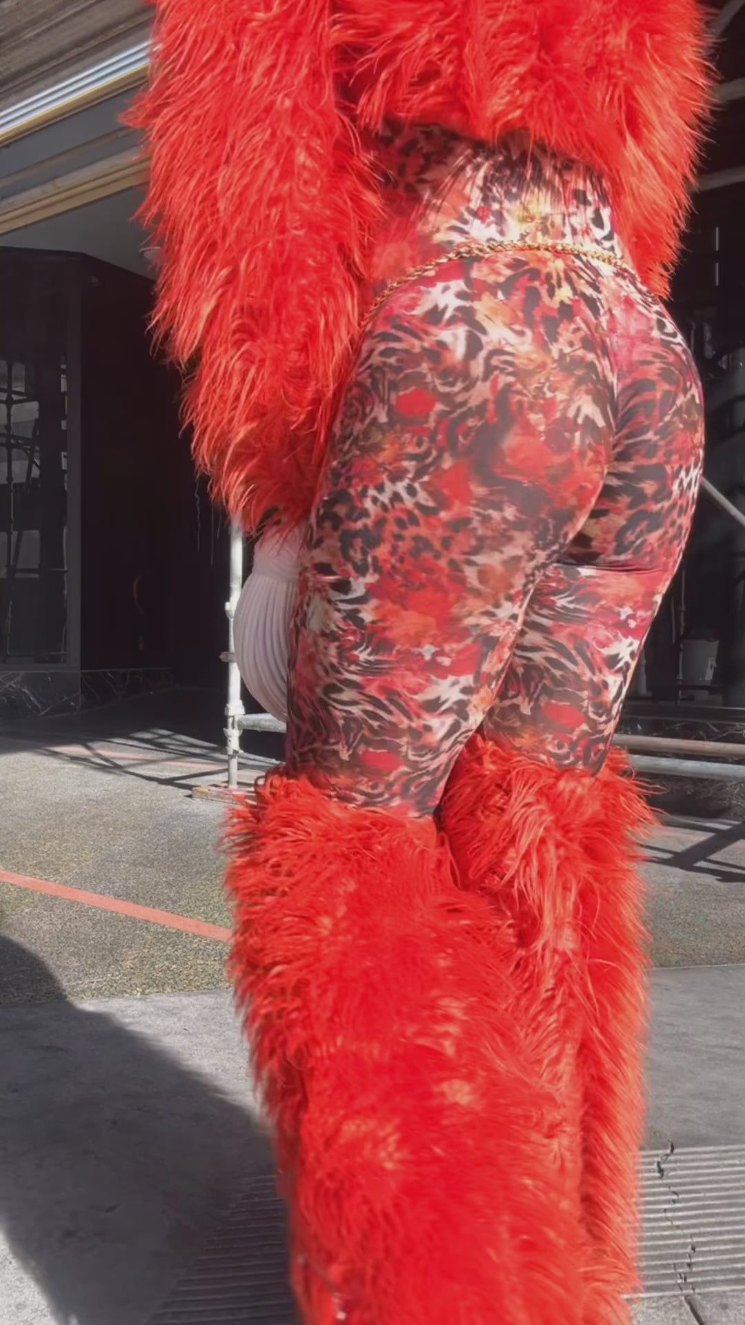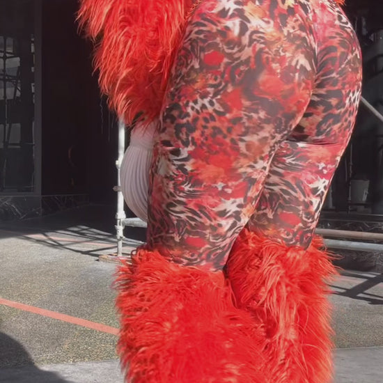 5 piece faux fur mini set that mimics Mongolian fur. Set includes: Jacket, leg warmers, mini skirt, and headband. Items can be worn separately with other looks. Model wearing Medium. Does not stretch. Made to order.