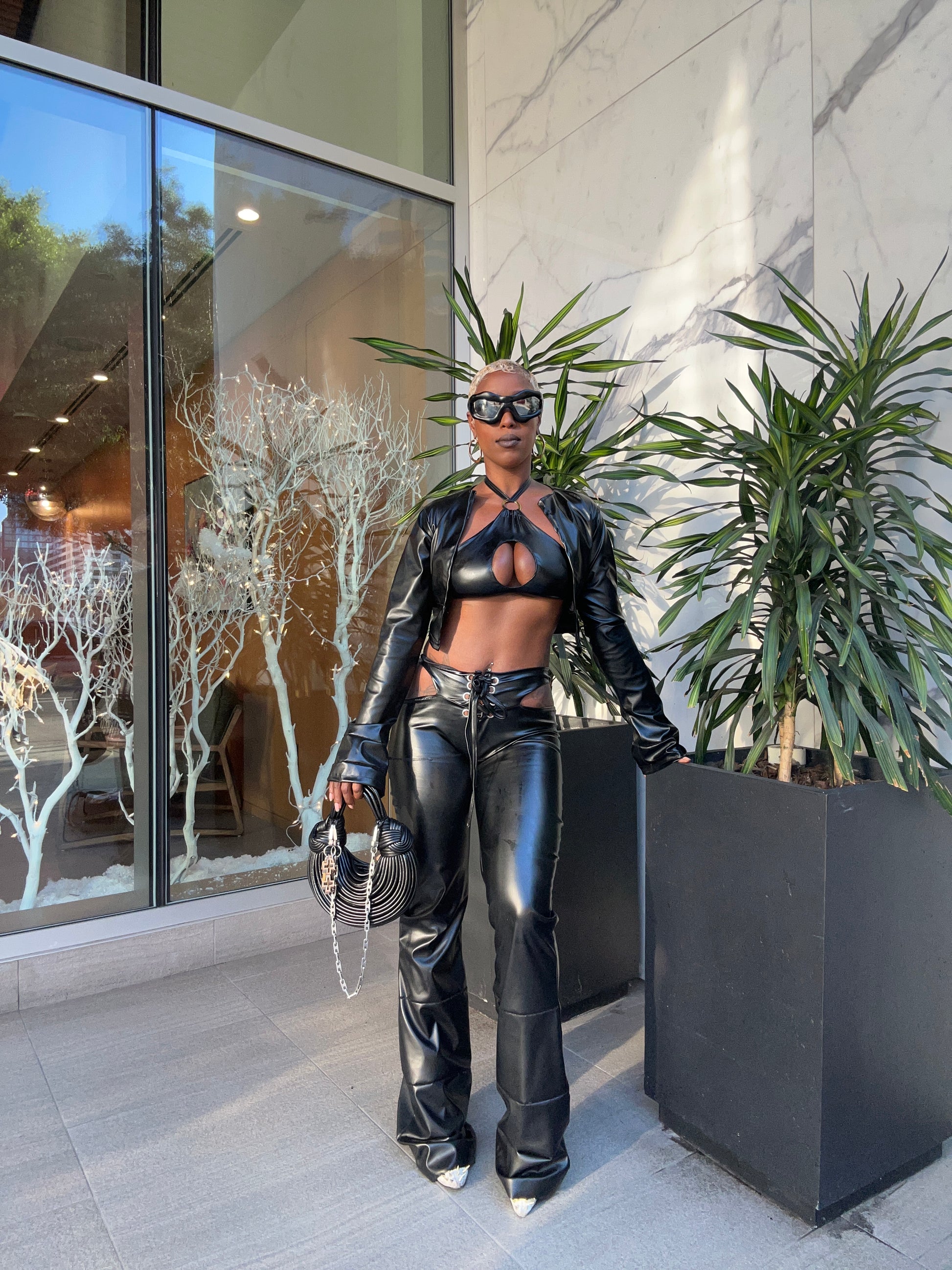 A retro inspired neckline, faux leather, cropped top with a cut out in the center of the breasts, gold accent on the neck where it ties.